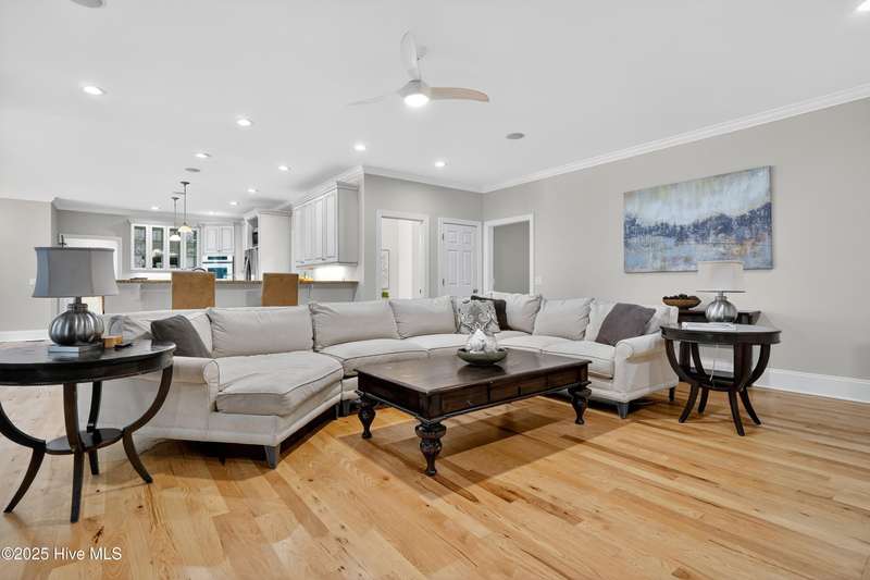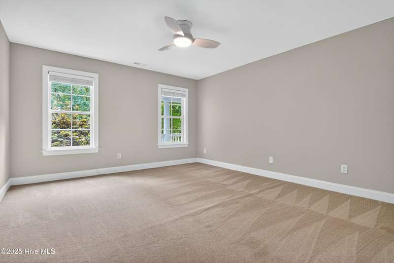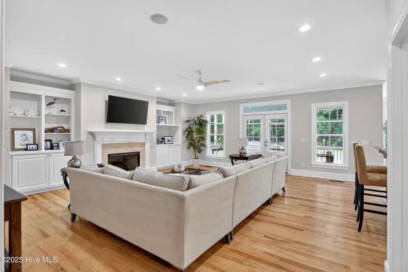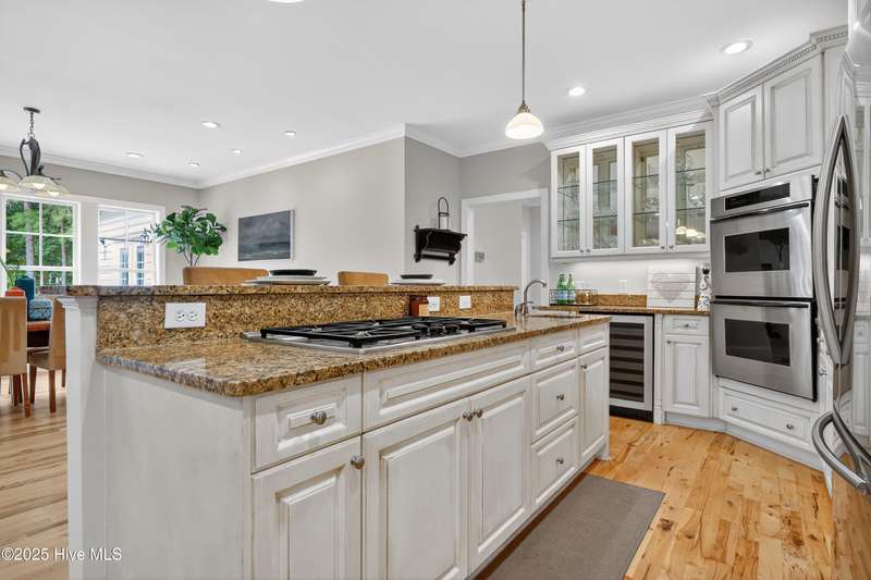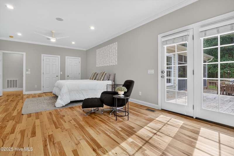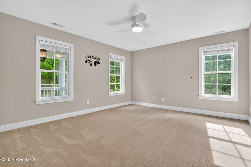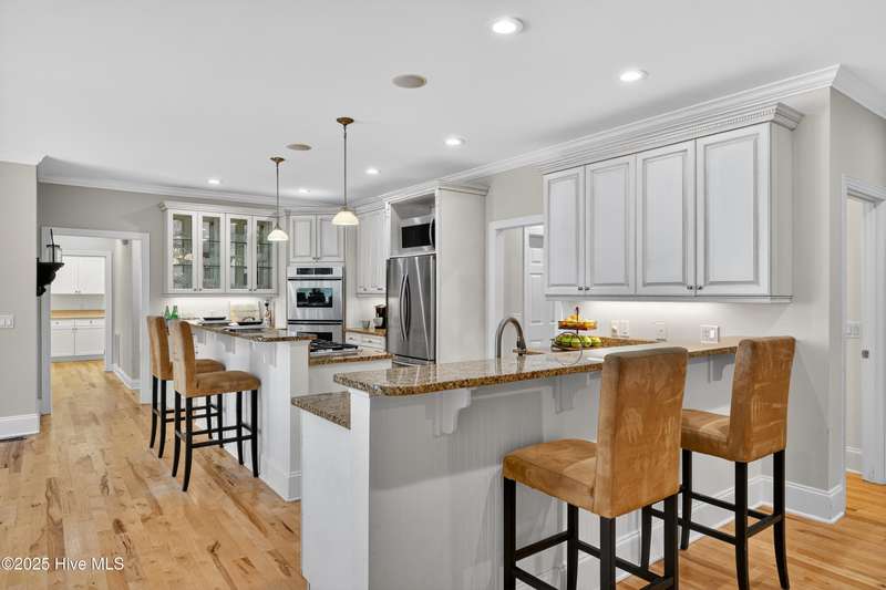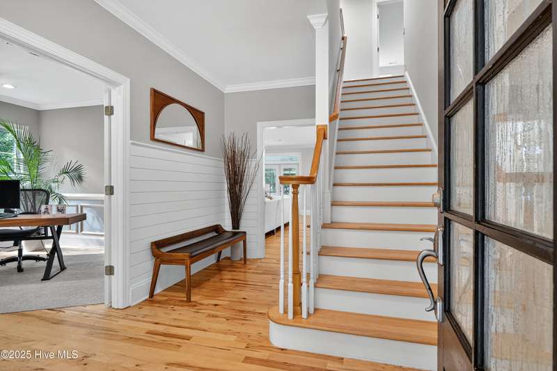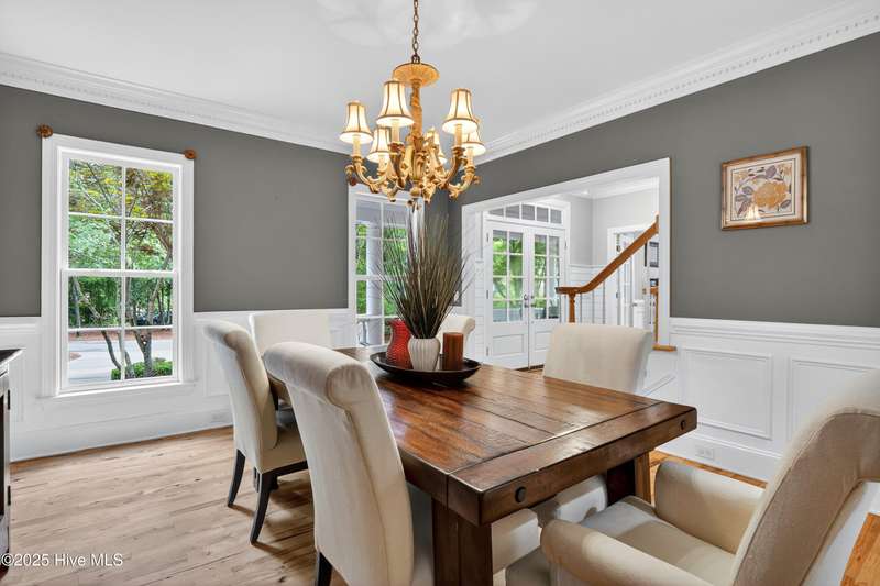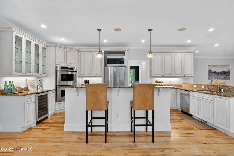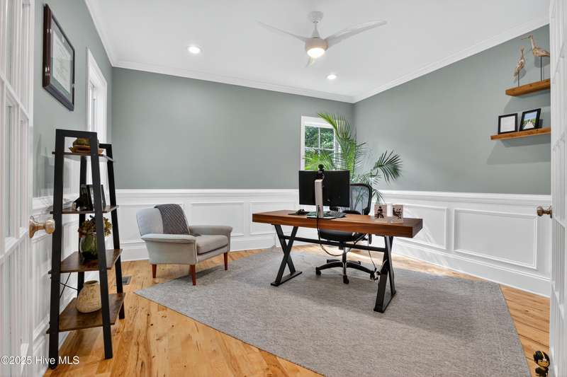 Welcome to Avenel, a waterfront community nestled along the Intracoastal Waterway just before the Figure Eight Island bridge. This rare gem boasts heavily wooded surroundings, tree-canopied roads, and spacious, private lots with gentle rolling hills, unique to the area. Avenel features newly refurbished docks and a community pier extending into the waterway, exuding Southern charm with its raised timber medians and distinctive street signs.This welcoming home sits at the end of a cul-de-sac, offering 220 feet of views on the 11th fairway of the exclusive Eagle Point Golf Club, a Tom Fazio design and top 100 course in the US, currently ranked #6 in North Carolina. This 4800 square foot Charleston inspired porch over porch invites you to relax in rocking chairs and relish the beauty of the outdoors. Inside, a formal dining room sets the stage for gatherings, while French doors lead to an office with panoramic windows. The first floor features an open floorplan with hickory hardwoods throughout. The chef's kitchen boasts a commercial-style gas range, wrap-around bar and island, and flows seamlessly with the large great room with gas log fireplace and sunny breakfast area all overlooking the park like setting of Eagle Point golf course. The screened porch and expansive deck provide the perfect spot to relax and enjoy the private expansive back yard. The downstairs primary suite, with direct access to the back deck, features two dedicated closets and a large bathroom complete with a tile shower, jacuzzi tub, dual vanities. Upstairs, a massive bonus room with a gaming closet and four large bedrooms (three with walk-in closets) await. Two large bedrooms share a Jack & Jill bath; perfect for kids. A third bedroom serves as a guest suite with its own bathroom and walk-in closet, while the fourth bedroom accesses the guest suite bath. Off the bonus room is an expansive unfinished space full of possibilities, and the third floor features a large, unfinished bonus room with