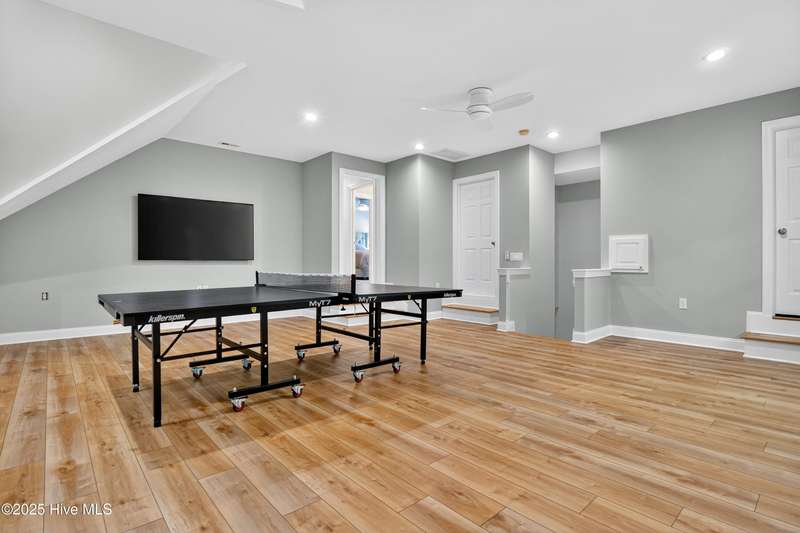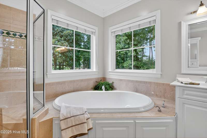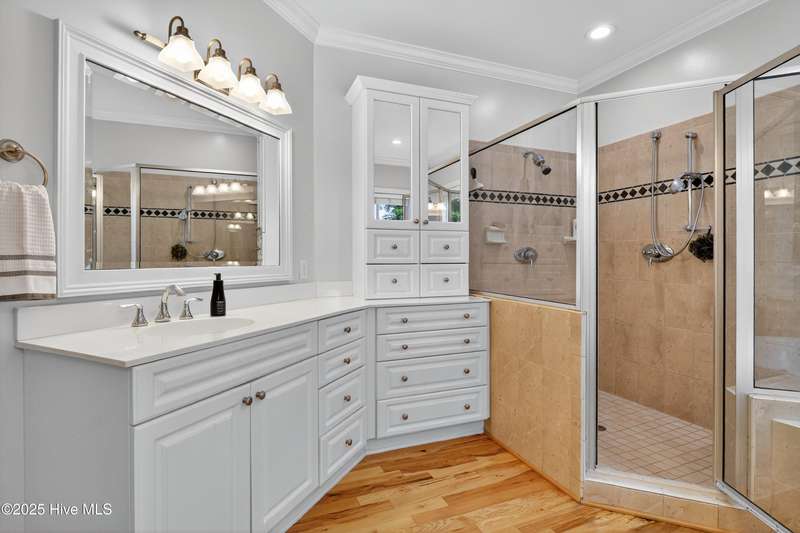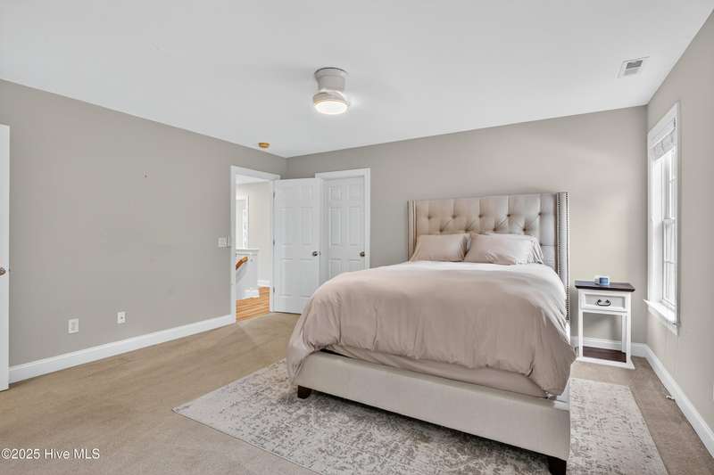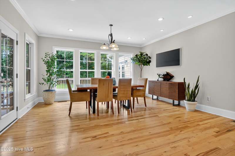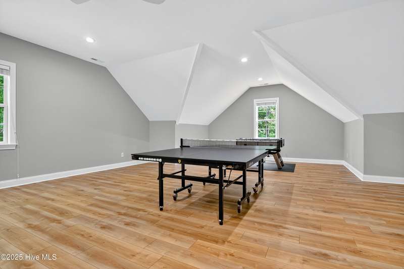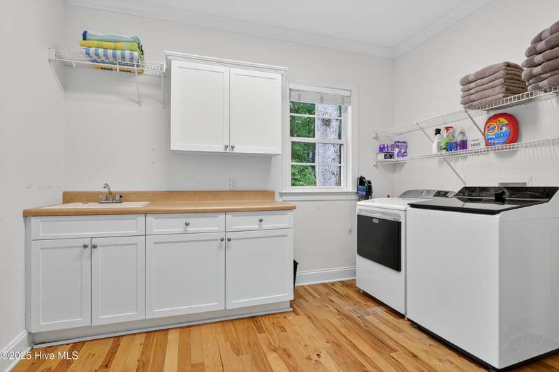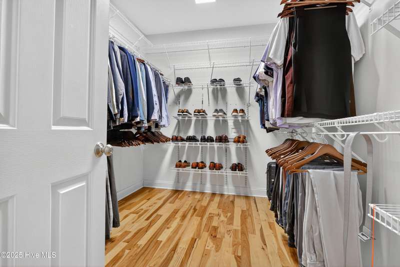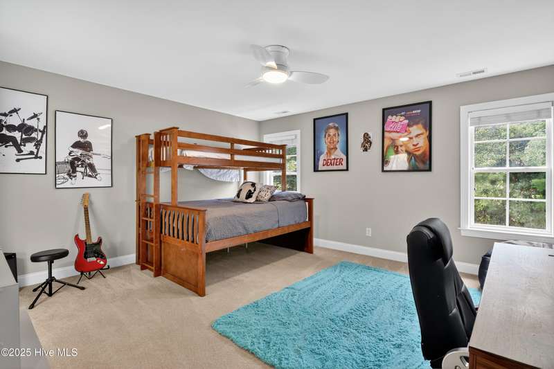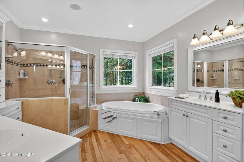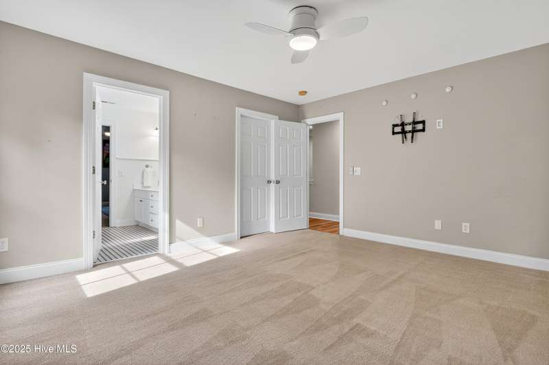 Welcome to Avenel, a waterfront community nestled along the Intracoastal Waterway just before the Figure Eight Island bridge. This rare gem boasts heavily wooded surroundings, tree-canopied roads, and spacious, private lots with gentle rolling hills, unique to the area. Avenel features newly refurbished docks and a community pier extending into the waterway, exuding Southern charm with its raised timber medians and distinctive street signs.This welcoming home sits at the end of a cul-de-sac, offering 220 feet of views on the 11th fairway of the exclusive Eagle Point Golf Club, a Tom Fazio design and top 100 course in the US, currently ranked #6 in North Carolina. This 4800 square foot Charleston inspired porch over porch invites you to relax in rocking chairs and relish the beauty of the outdoors. Inside, a formal dining room sets the stage for gatherings, while French doors lead to an office with panoramic windows. The first floor features an open floorplan with hickory hardwoods throughout. The chef's kitchen boasts a commercial-style gas range, wrap-around bar and island, and flows seamlessly with the large great room with gas log fireplace and sunny breakfast area all overlooking the park like setting of Eagle Point golf course. The screened porch and expansive deck provide the perfect spot to relax and enjoy the private expansive back yard. The downstairs primary suite, with direct access to the back deck, features two dedicated closets and a large bathroom complete with a tile shower, jacuzzi tub, dual vanities. Upstairs, a massive bonus room with a gaming closet and four large bedrooms (three with walk-in closets) await. Two large bedrooms share a Jack & Jill bath; perfect for kids. A third bedroom serves as a guest suite with its own bathroom and walk-in closet, while the fourth bedroom accesses the guest suite bath. Off the bonus room is an expansive unfinished space full of possibilities, and the third floor features a large, unfinished bonus room with