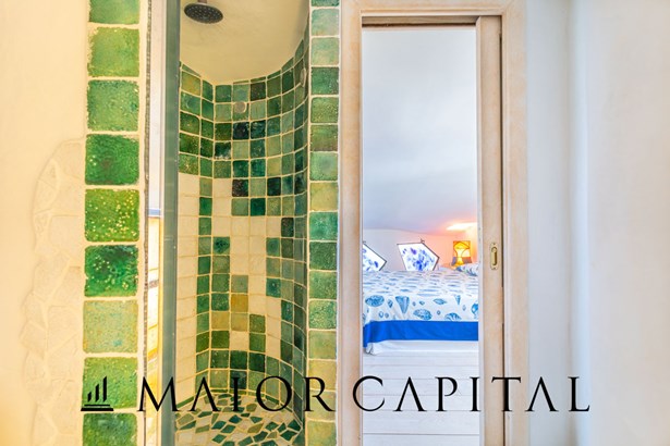 Inside, the villa features handcrafted commissioned finishes and furniture details that make it unique and elegant. Each room is distinguished by a different detail, such as the granite fireplace, the wrought iron and juniper staircase recalling Sardinian tradition, or the emerald-green Cera Sarda bathroom with starfish recalling sea life.