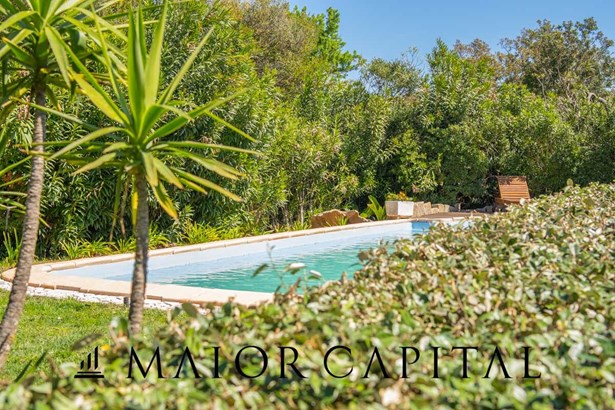 A driveway leads to the well-kept garden that surrounds the property and features a beautiful swimming pool and specially designed outdoor areas for experiencing the house in its entirety. Here, in fact, we find a beautiful dining area, brickwork sofas and a barbecue built in perfect harmony with the property and its natural surroundings.