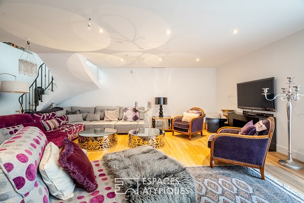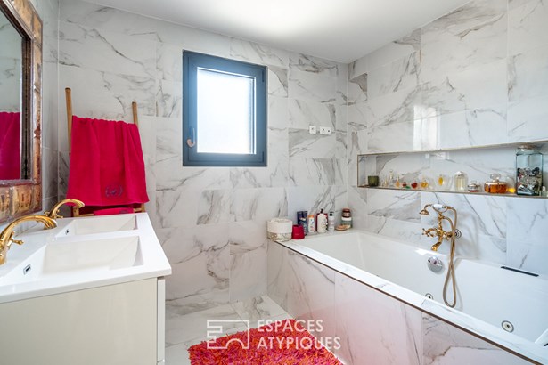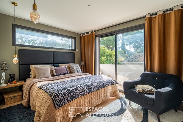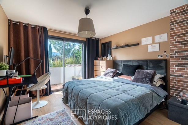 The living spaces, arranged around a large living room, open directly onto the exterior and the swimming pool. The kitchen, separated by a sliding industrial-style glass partition, integrates naturally into the living area, where the volumes flow together with fluidity. A magnificent wrought-iron staircase leads to the upper floor, where the master suite and two bedrooms share a bathroom. This level benefits from a large balcony accessible from every room. On the lower level, a 70sqm space, currently used for storage and relaxation, could be converted into a self-contained apartment with a living room, bedroom, and bathroom. The exterior is designed around the swimming pool, which is the true centerpiece and offers several distinct areas including an outdoor lounge, dining table, petanque court, and a children's play area.