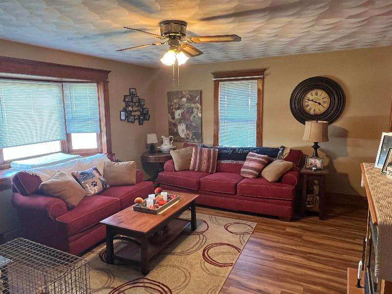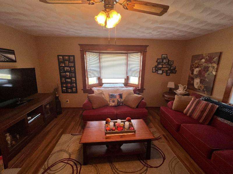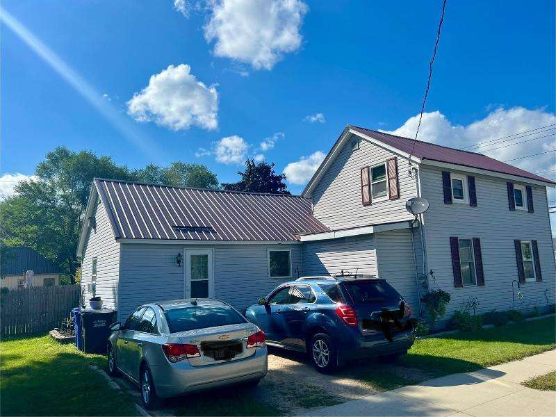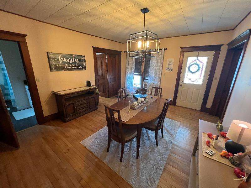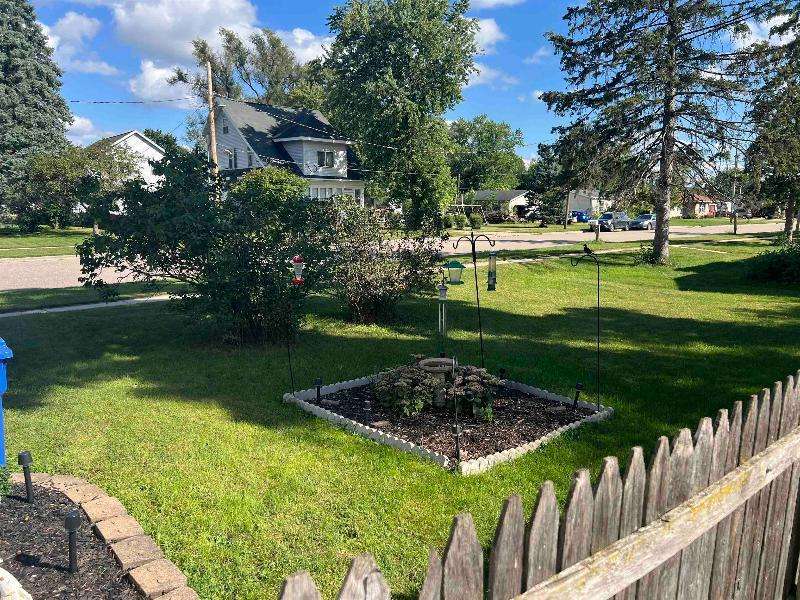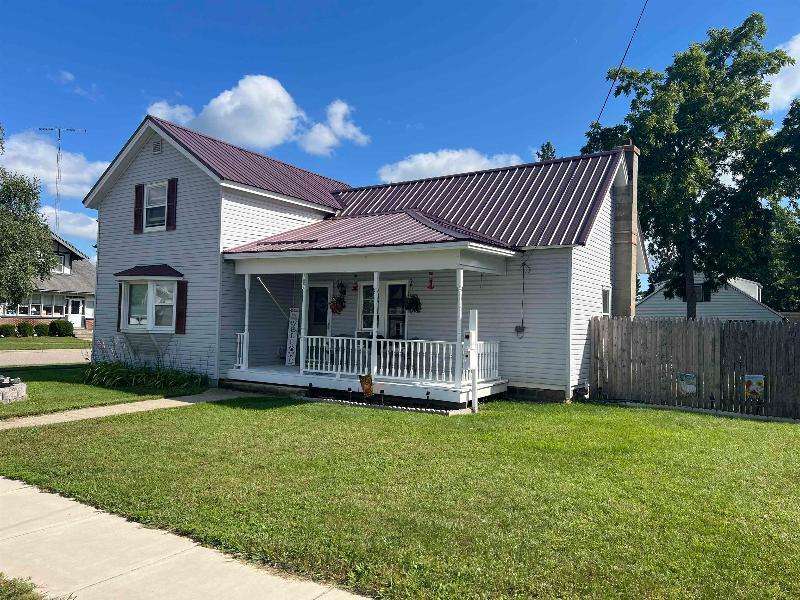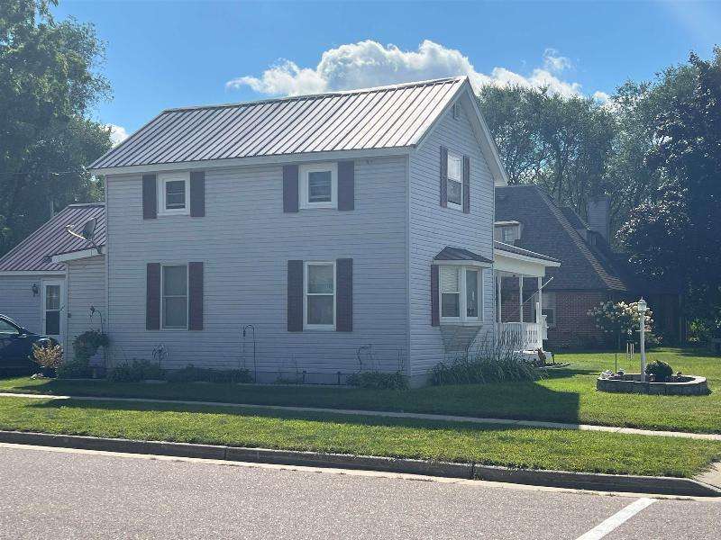 Step into timeless charm with this beautifully maintained home featuring rich woodwork, original pocket door, and a cozy knotty pine family room that exudes warmth and character. Enjoy the convenience of main floor laundry, a formal dining room plus a sunny breakfast nook, perfect for both everyday living and entertaining. Relax on the covered front porch or unwind on the back deck and enjoy the privacy of the fully fenced backyard. The metal roof and newer windows in the dining room and upstairs offer durability. Situated on a corner lot, just steps from downtown shops, restaurants, schools, parks, lakes, and the brand new Kwik Trip -- this location combines small-town charm with modern convenience.