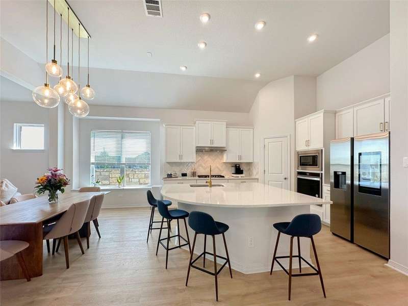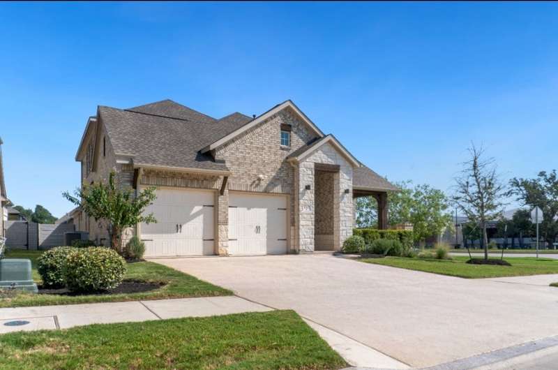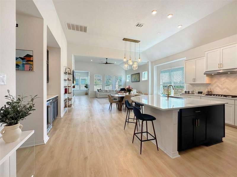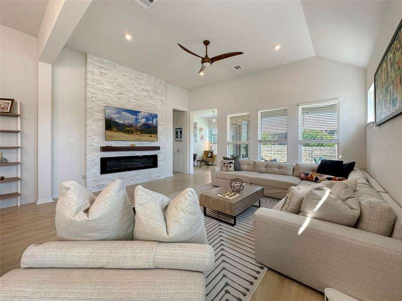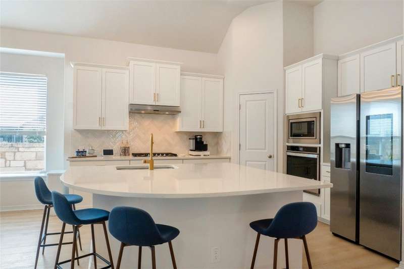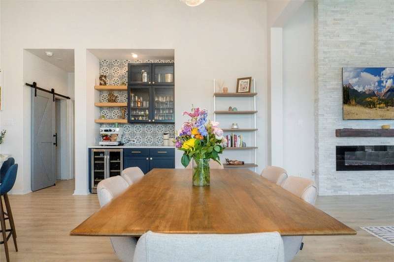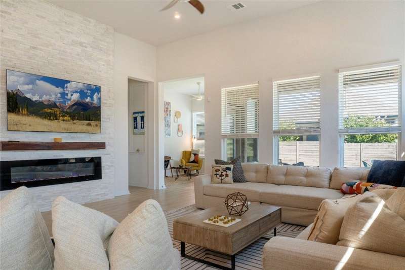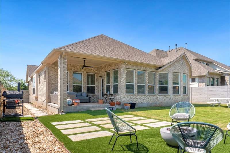 * Additional 7500 Buyers Closing Cost Credit At Closing* This beautifully upgraded home is a true gem, offering $80K in structural upgrades and $25K in interior design enhancements that elevate its charm and functionality. This residence has been thoughtfully customized by the owners, and every detail was accounted for in this lovely, mid-century modern sanctuary, including West Elm light fixtures throughout. The expansive 1.5 story floor plan seamlessly blends modern convenience with elegant design, featuring a customized wine and coffee bar, a stunning stone statement wall with a fireplace, and high-end appliances complemented by sleek quartz countertops. Additional upgrades include a spacious home office, a serene sunroom, and a versatile upstairs loft—providing ample space for every need, and perfect for a mother in law suite/teenager space, or a guest haven. The elegance continues in the backyard offering a privacy fence, a built-in gas pizza oven, that can easily embrace an outdoor kitchen design by its new owners. The artificial turf allows an entertainment area, leaving the natural grass ready for a plunge pool or play area. The home is equipped with an upgraded garage consisting of: a Tesla wall charger, automatic irrigation system, additional storage, water softener loop, mounted mirrors, and epoxy flooring, making this home as practical as it is beautiful. This is a rare opportunity to own a home that combines luxury, comfort, and thoughtful customization in every detail. Located walking distance to Wolf Ranch Elementary, River Camp Amenity Center, community pool, and picturesque walk and bike trails. This home has a feeling you just have to experience for yourself! Come and see it today!