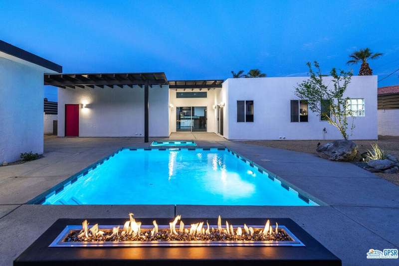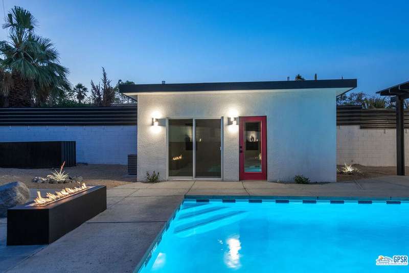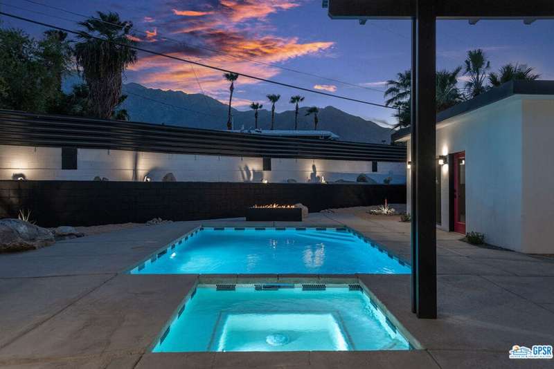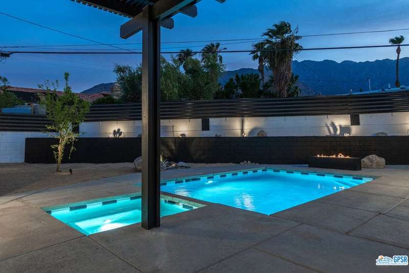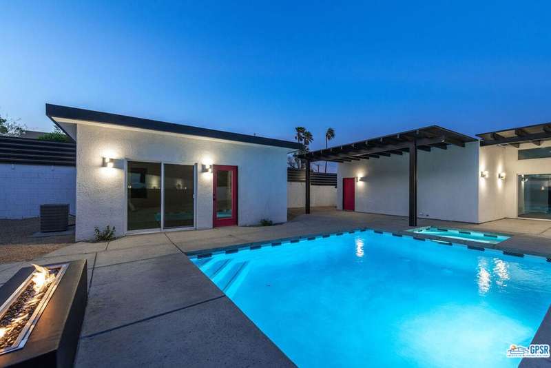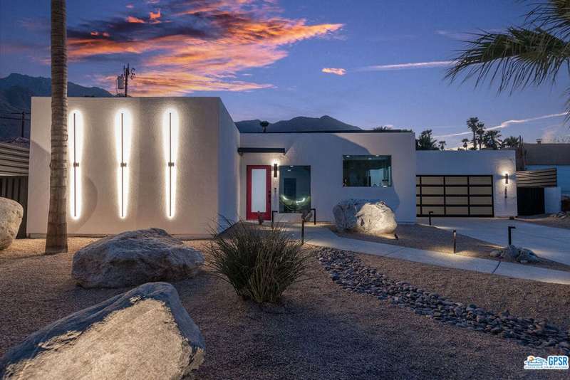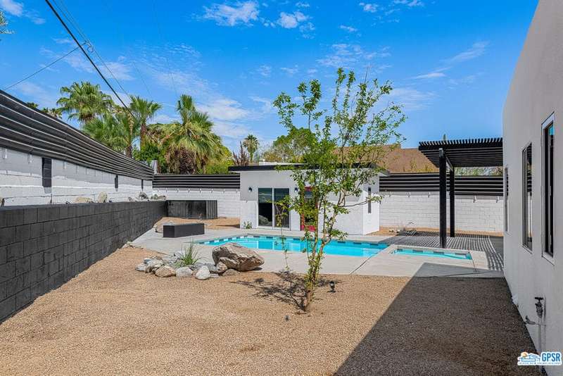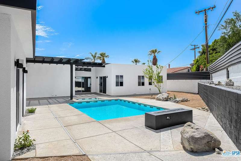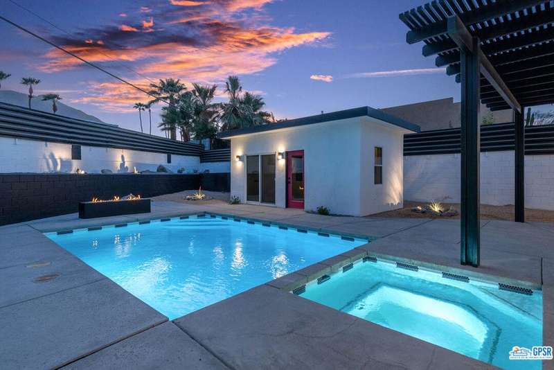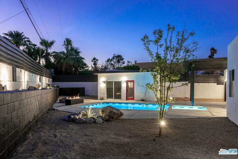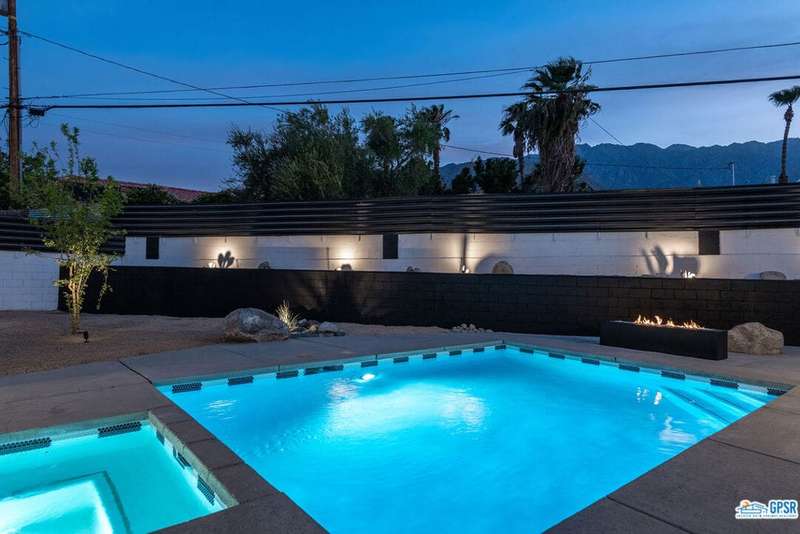 Contemporary and stylishly updated 3-bedroom, 3-bathroom home in the Chino Canyon neighborhood of Palm Springs. The main house features an open-concept kitchen with a generous bar area, sleek concrete floors, and a spacious living room with a gas fireplace, ideal for comfortable everyday living and entertaining. Two primary suites include walk-in showers and sliding doors that open directly to the outdoor space. A detached guest house offers a private third bedroom and bathroom, perfect for visitors, extended stays, or a dedicated home office. Step outside to take in stunning mountain views from the pool and spa, or unwind by the built-in fire feature under the desert sky. Additional amenities include a two-car garage, in-home laundry, and utilities included: solar electricity, water, trash, landscaping, and pool service.