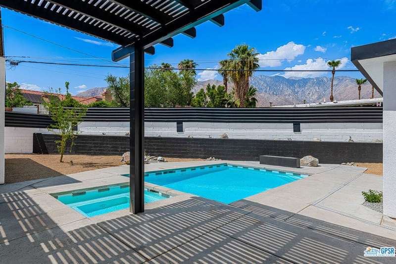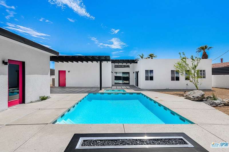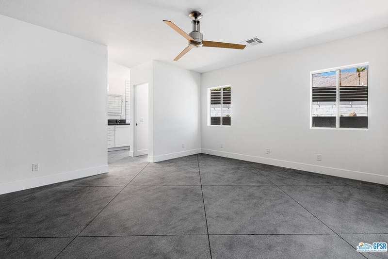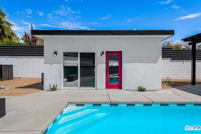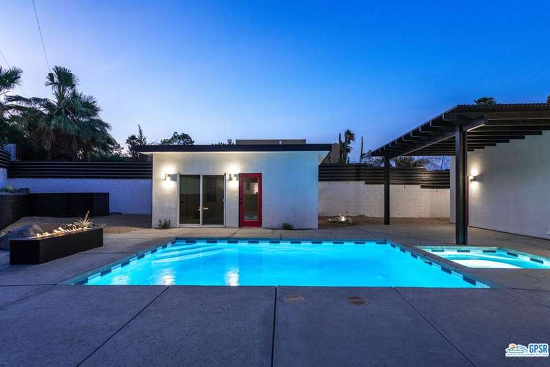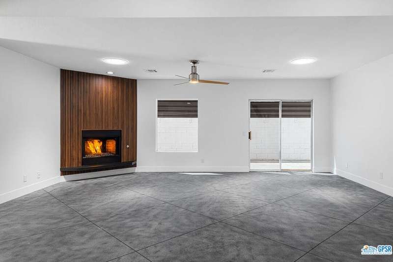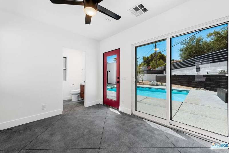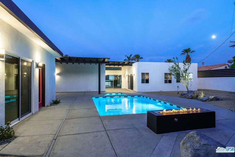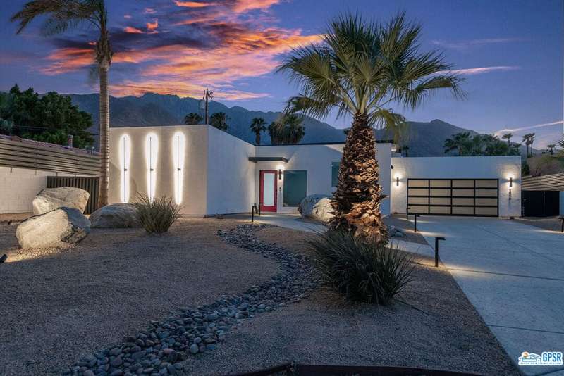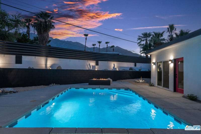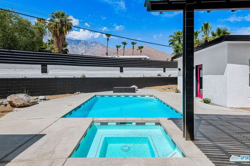Contemporary and stylishly updated 3-bedroom, 3-bathroom home in the Chino Canyon neighborhood of Palm Springs. The main house features an open-concept kitchen with a generous bar area, sleek concrete floors, and a spacious living room with a gas fireplace, ideal for comfortable everyday living and entertaining. Two primary suites include walk-in showers and sliding doors that open directly to the outdoor space. A detached guest house offers a private third bedroom and bathroom, perfect for visitors, extended stays, or a dedicated home office. Step outside to take in stunning mountain views from the pool and spa, or unwind by the built-in fire feature under the desert sky. Additional amenities include a two-car garage, in-home laundry, and utilities included: solar electricity, water, trash, landscaping, and pool service.