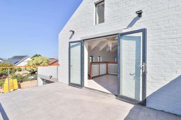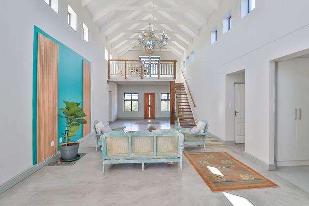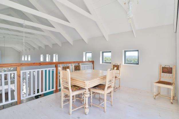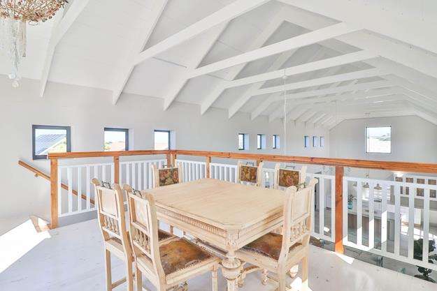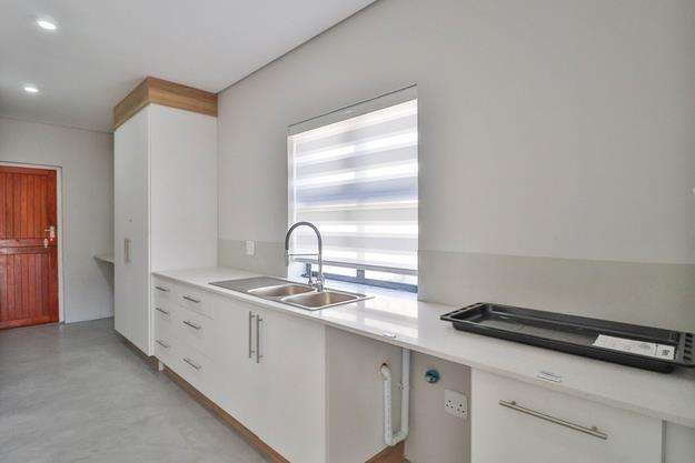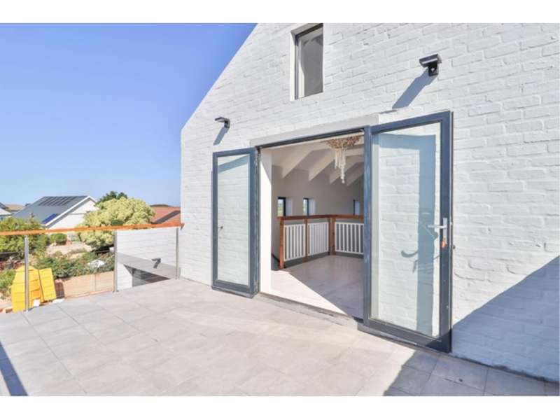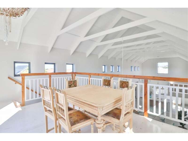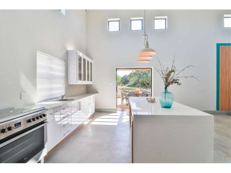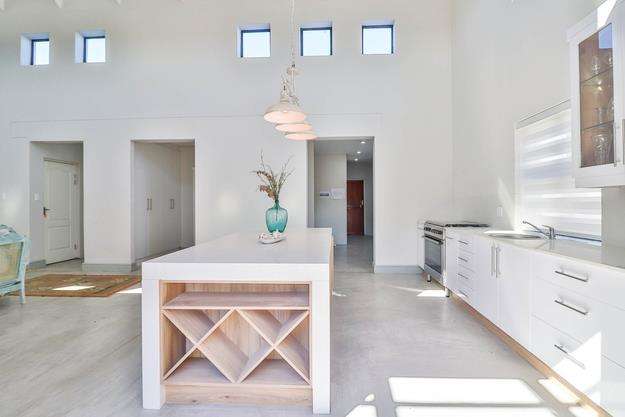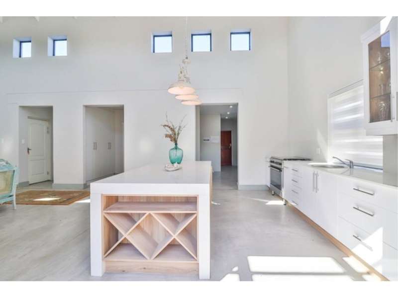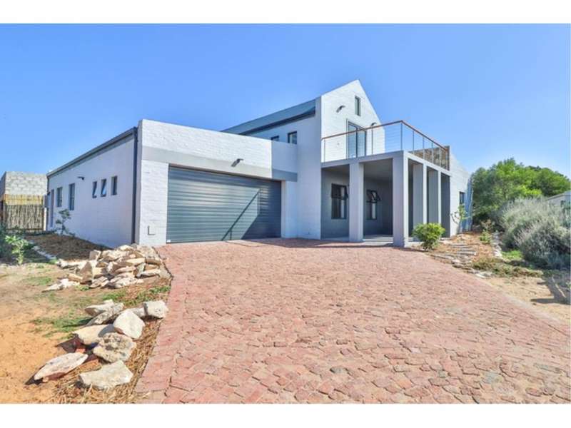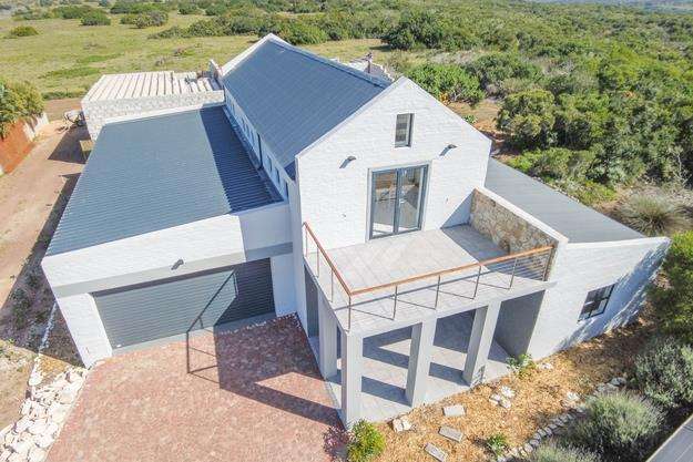 Newly constructed three-bedroom, three-bathroom home crafted by architects, boasting a spacious double-volume living and dining area. The kitchen seamlessly blends classic and contemporary design, featuring ample space for appliances, a convenient coffee station, pantry cupboard, separate scullery, and laundry area. A dedicated workspace with abundant storage is ideal for remote work. Outside, an inviting patio with a built-in braai offers the perfect setting for entertaining, complemented by a double garage featuring an automated aluminum door. Upstairs, a versatile mezzanine floor provides potential for an additional bedroom or children's space, while an outdoor balcony treats residents to picturesque ocean views. Each bedroom is equipped with generous built-in wardrobes, with ample storage solutions throughout the home, including a linen cupboard. Nestled in the heart of Stilbaai, the property enjoys a prime location bordering a lush green belt on two sides. To the north, a designated indigenous park area ensures preservation, while the home sits at the end of a horseshoe-shaped street (Klapperbos Crescent), offering unobstructed sea vistas from the loft and upper balcony.