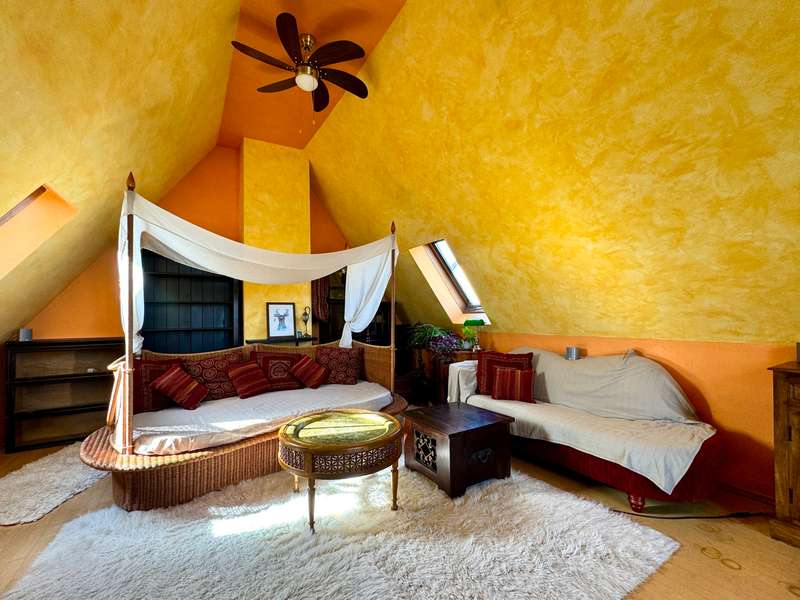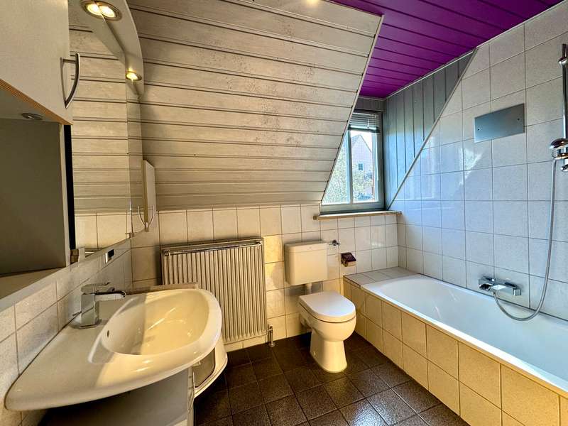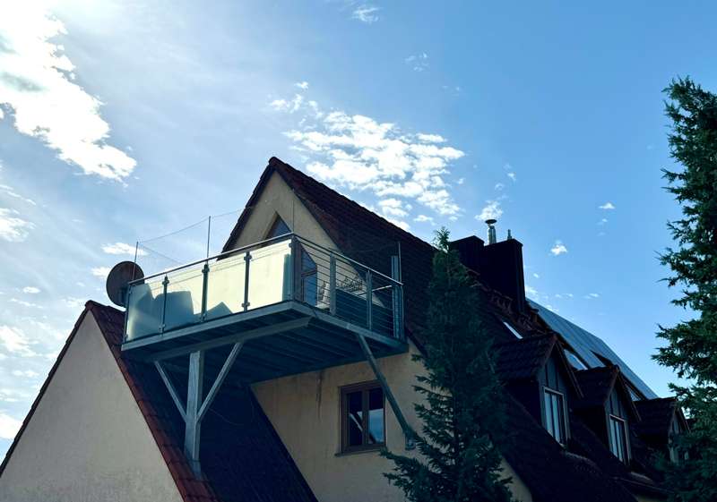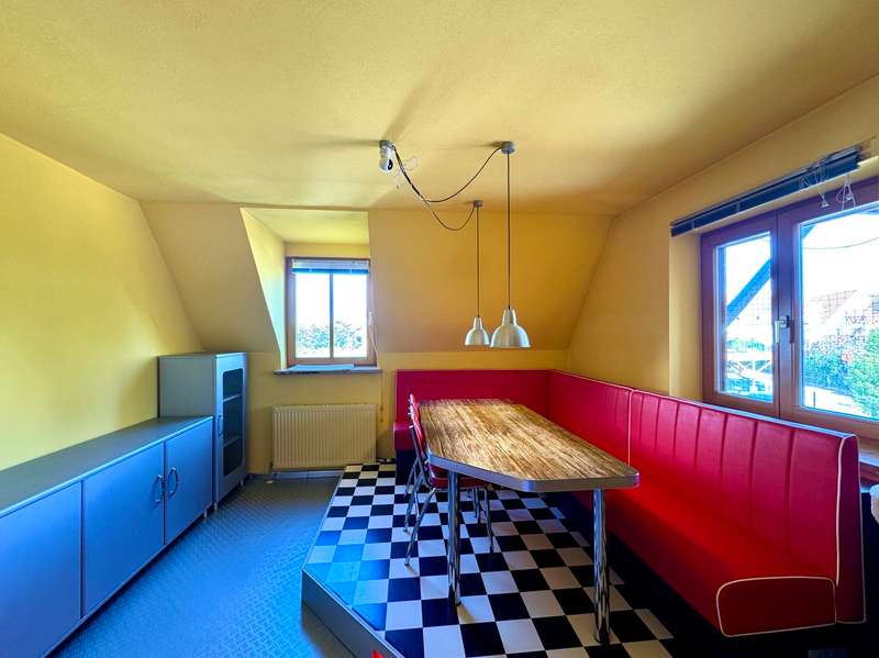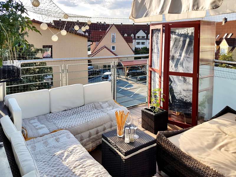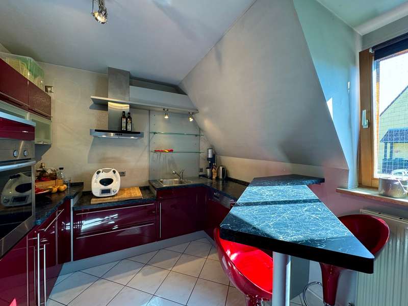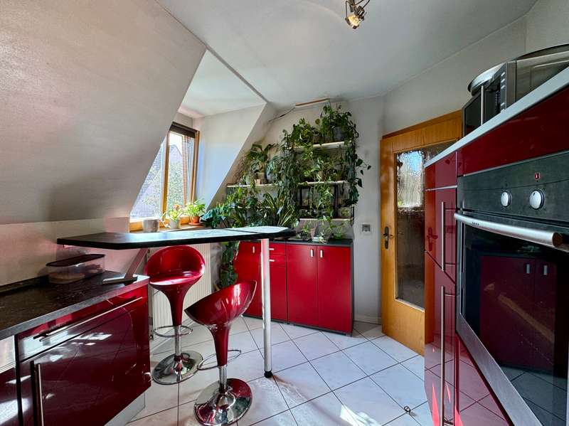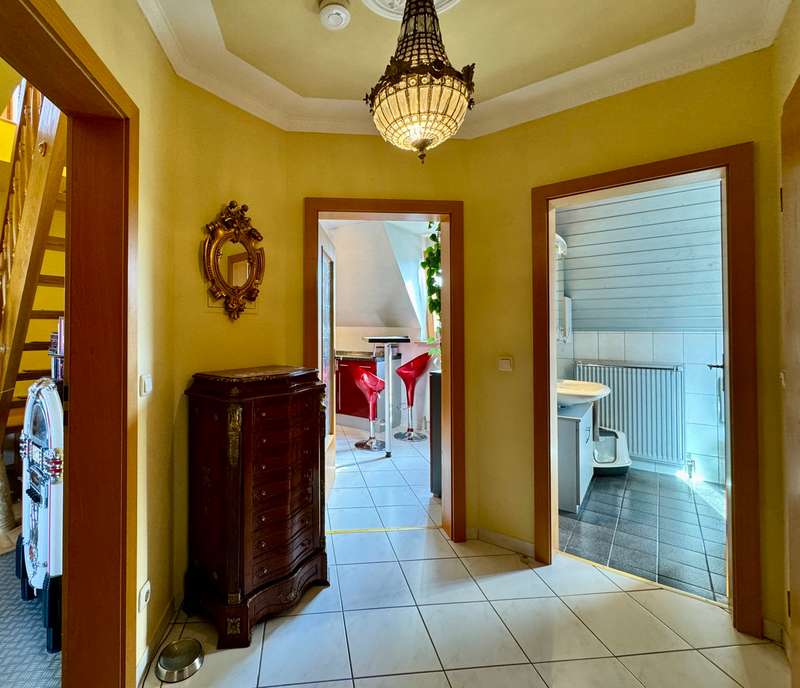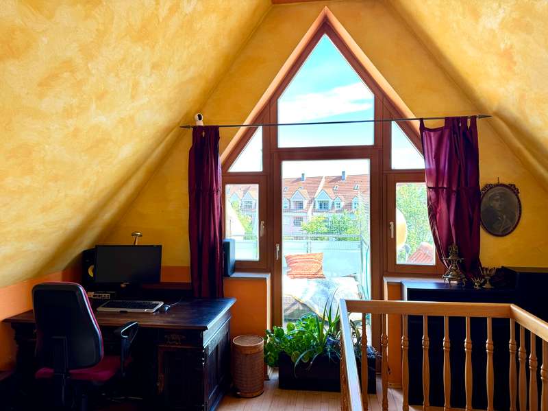 This impressive maisonette apartment is an absolute rarity and impresses with its spaciousness and special charm. In an attractive residential complex, which is exclusively used by residents, you will experience the advantages of a quiet yet central life. All important local amenities and the highway are within easy reach, and the beautiful city of Regensburg is only a few minutes away. Room layout and design: The apartment is located in an elegant two-family house and conveys a real house feeling thanks to its two living levels. Upon entering, you are greeted by an inviting hallway with ample space for a wardrobe. The modern kitchen is equipped with a stylish fitted kitchen featuring high-quality brand-name appliances. A small counter creates a cozy dining area. The bathroom impresses with a bathtub and generous natural light. Here, a timeless tile design harmonizes with a cosy atmosphere. The bedroom on the first living level is generously proportioned and offers plenty of space for your personal furniture. Optionally, the living areas can be used flexibly so that the second floor can be set up as a spacious bedroom. Comfortable dining areas and light-flooded living spaces: The large dining room can be equally furnished with an inviting corner bench and a large table with pedestal - the ideal place for sociable evenings with friends and family. An elegant wooden staircase leads to the upper living level, where a light-flooded living room with high ceilings awaits you. The large panoramic window provides a pleasant feeling of space and plenty of natural light, ideal for a cozy living room with a small home office area. The highlight - your private roof terrace: An absolute highlight of this apartment is the spacious roof terrace, which offers you a breathtaking all-round view. Here you can set up a cozy seating lounge and plant arrangements to spend relaxing hours outdoors on warm days. The balcony is also equipped with a water connection for watering plants and a power connection for lighting or a barbecue. High-quality furnishings and practical benefits: The apartment is partly fitted with high-quality vinyl and parquet flooring, while the kitchen, hallway and bathroom boast stylish tiles. Further benefits include a private garage with electricity and an additional parking space directly in front of the garage. A large hobby room rounds off this first-class offer. This maisonette apartment combines stylish living with a high level of comfort and quality of life. Come and see this unique opportunity for yourself! Don't miss out on this residential paradise and arrange a viewing today.