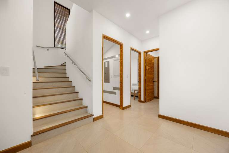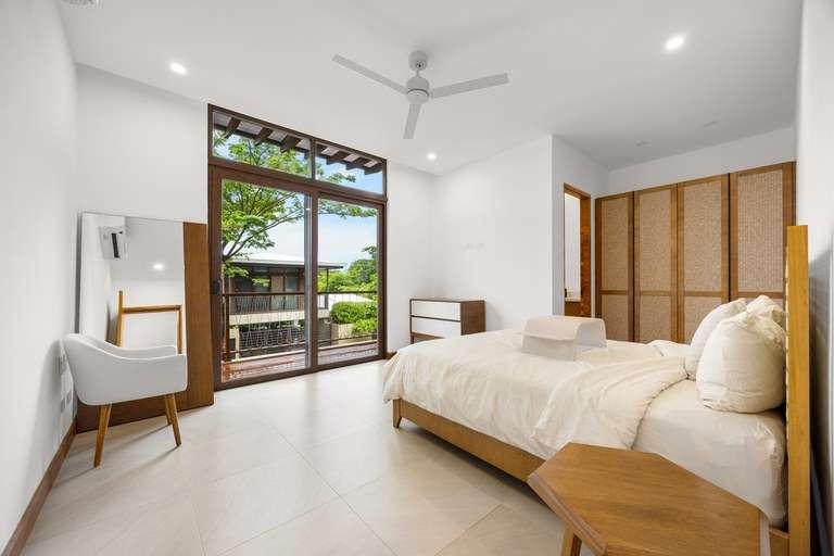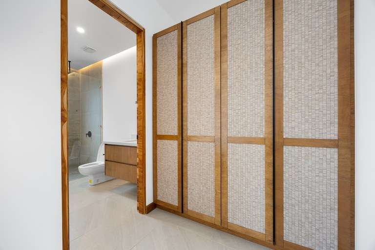 Each of the three bedrooms is designed with comfort and style in mind. The master suite boasts a private balcony with a partial view of Langosta Beach, offering a serene spot to unwind. The second bedroom also includes a private balcony, providing another peaceful space to enjoy the fresh air. The third bedroom features a compact interior garden that can serve as a yoga deck or a quiet lounging area, bringing the calming essence of nature indoors.