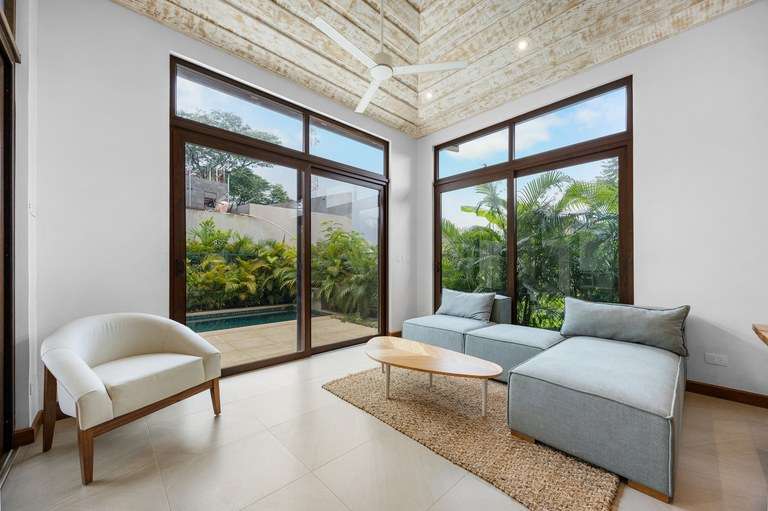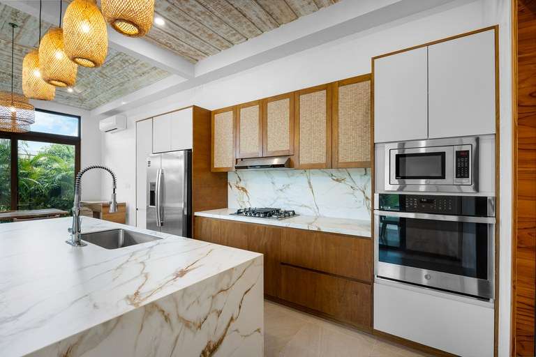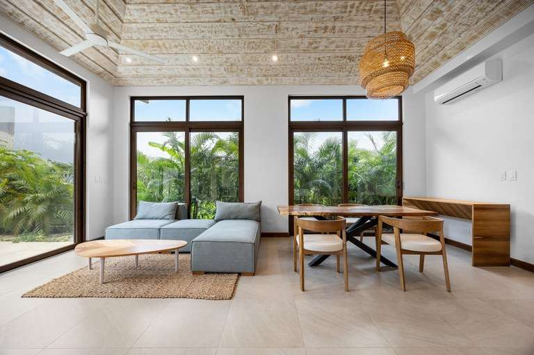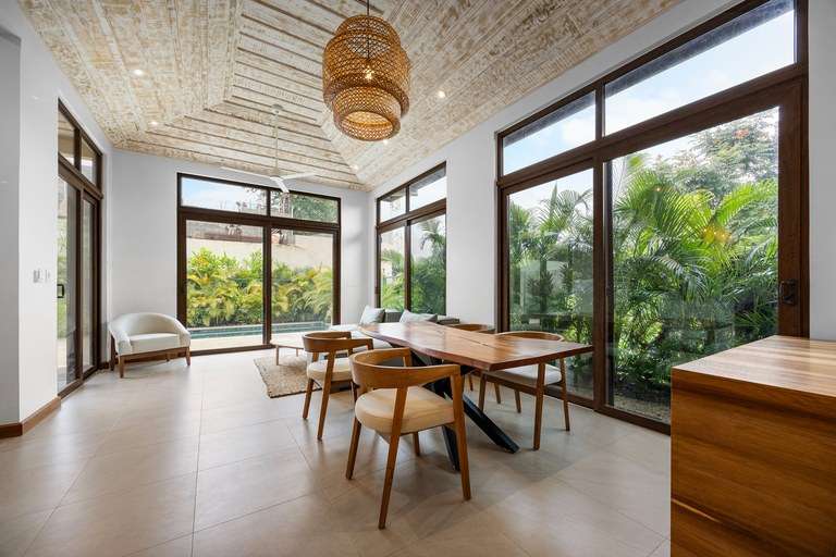 As you step into Casa Bromelia, you are greeted by a bright and airy living area, where large windows frame the surrounding greenery and flood the space with natural light. The neutral color palette creates a cozy yet modern feel, making the living area an inviting space for relaxation or entertaining. Adjacent to the living area is a sleek, modern kitchen featuring high-end appliances, custom cabinetry, and a spacious island with a breakfast bar — perfect for casual dining and socializing.