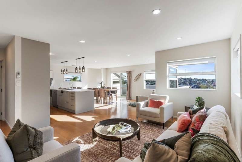This spacious and modern four-bedroom, three-bathroom family home is the perfect blend of style, comfort, and convenience. Set on a freehold 400sqm section, this low-maintenance property is designed for busy families. The weatherboard construction ensures durability, while the thoughtful layout caters to all ages. On entry level, you'll find a sun-filled open-plan kitchen, dining, and lounge area flowing onto a private deck—perfect for entertaining. Also on this level, a large bedroom and bathroom. While the Master Bedroom & en-suite enjoys extra privacy on the upper level. Downstairs 2 further bedrooms, bathroom and lounge/Media Room, providing privacy and independence. A double internal-access garage and off-street parking add to the home’s practicality. Zoned for top schools, including Rangitoto College, Murrays Bay Primary, and Northcross Intermediate, this location ensures excellent education options. Enjoy easy access to Apollo Medical Centre, cafes, transport, and the motorway. Browns Bay Village and Beach are just minutes away, offering a vibrant mix of shops, restaurants, and coastal walks. If you’re after a stylish, low-maintenance home in a prime North Shore location, this is an opportunity not to be missed! Secure your family’s future today.