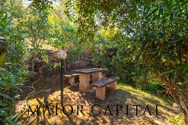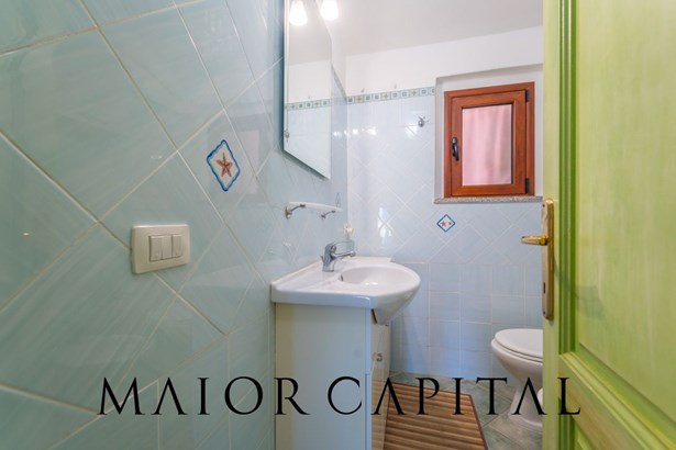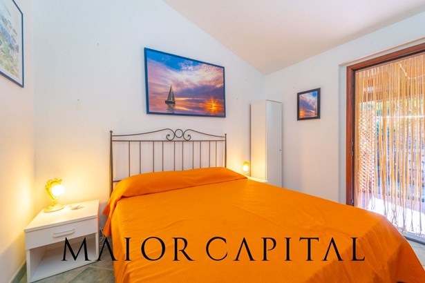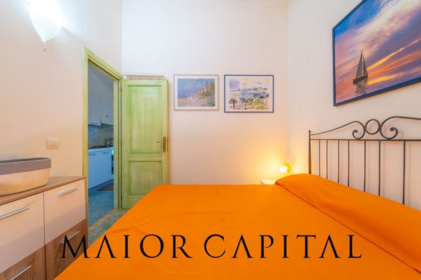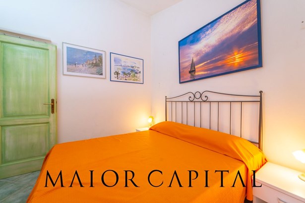 The sleeping area consists of a double bedroom and a bathroom with window and shower. The bedroom leads directly to an internal courtyard equipped with a barbecue, which leads to a second, more private garden with a stone table and benches, ideal for al fresco dining with a glimpse of the sea.