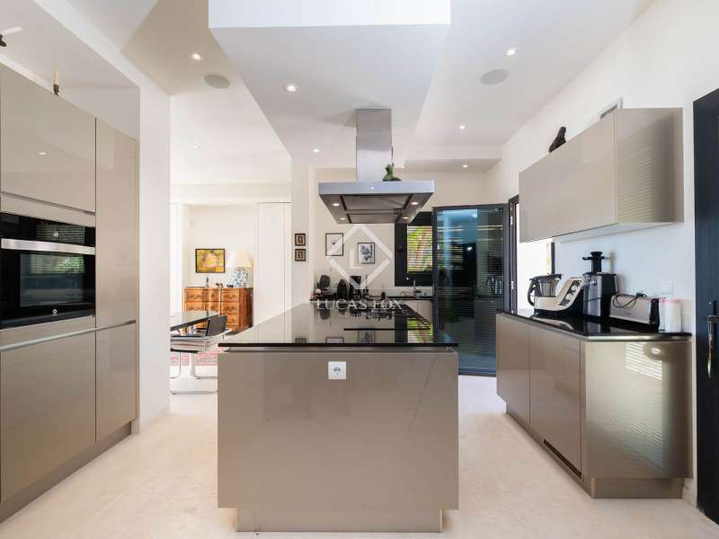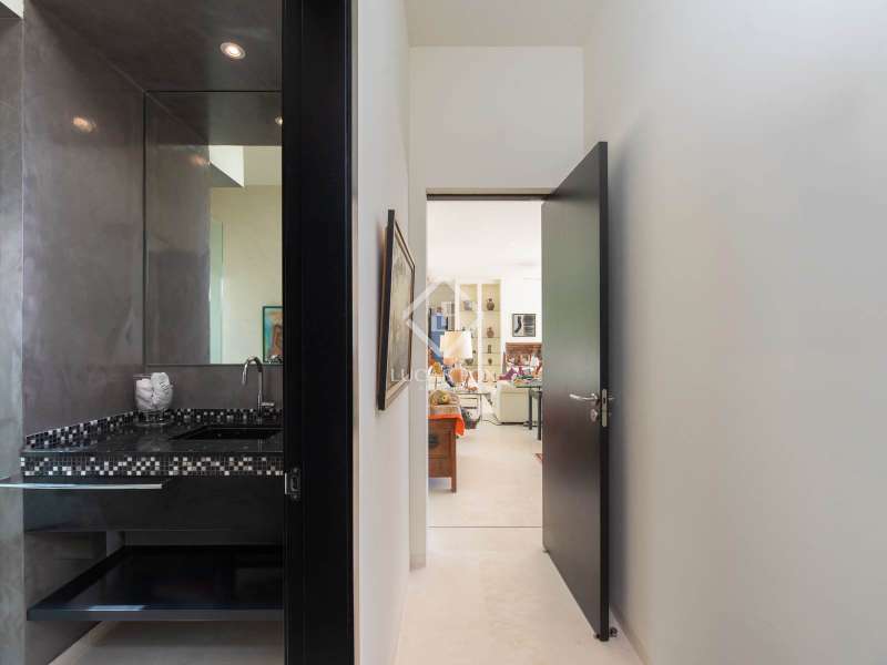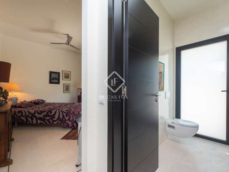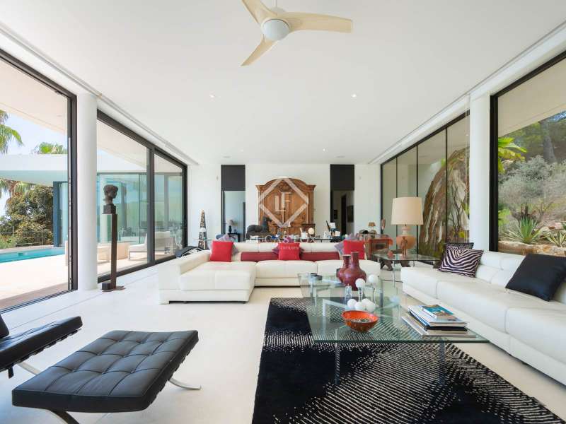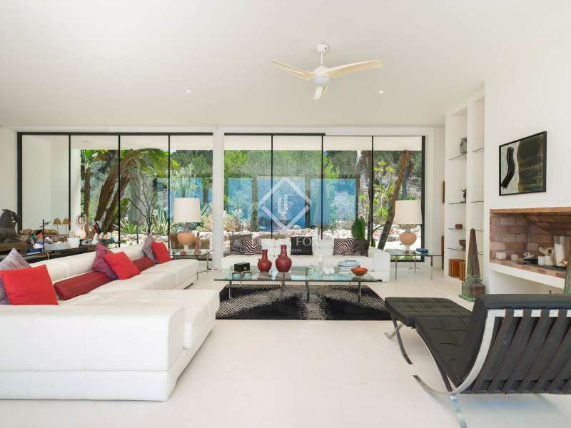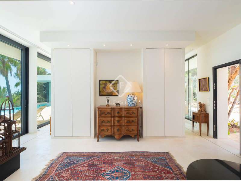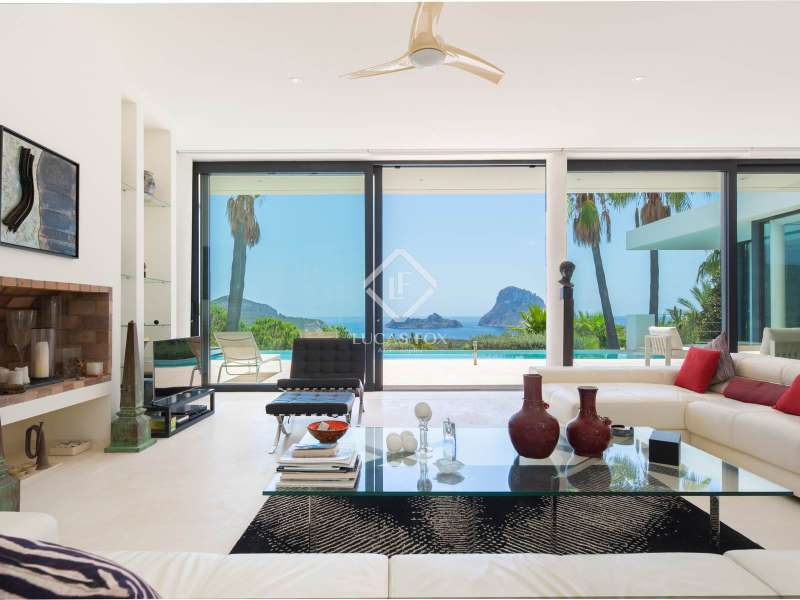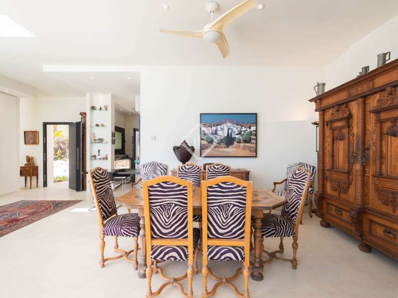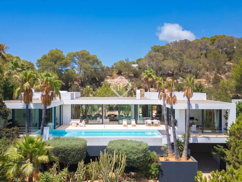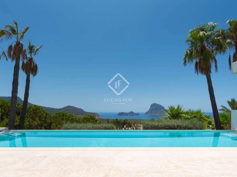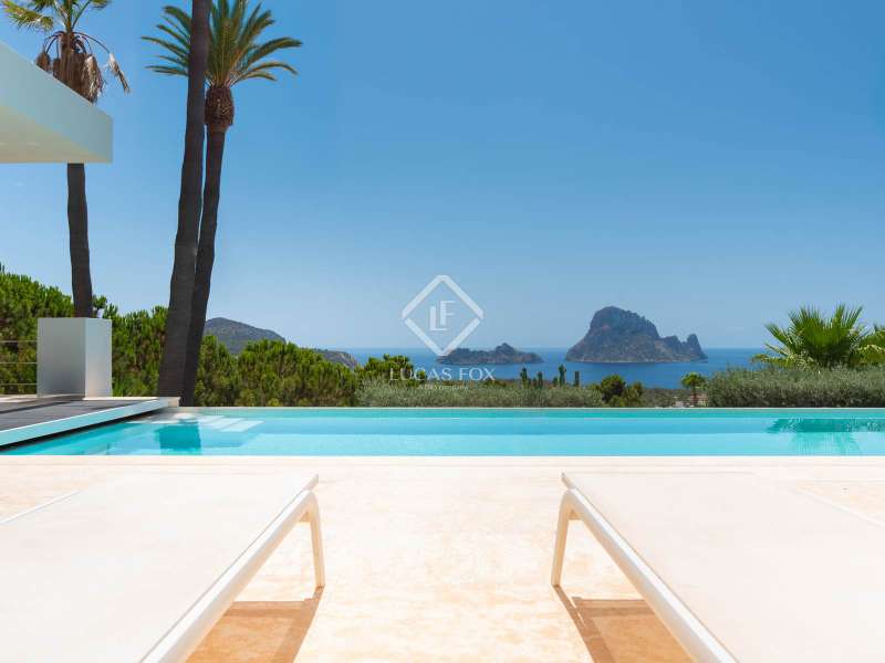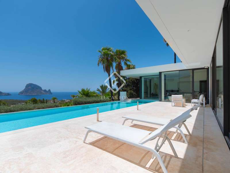 This exceptional modern villa is located on Ibiza’s west coast in the tranquil area of Cala Carbo, offering magnificent panoramic sea views and unforgettable sunsets over the iconic island of Es Vedra. Just a 3-minute drive from the charming Cala Carbo beach and 10 minutes from the lively village of San Jose, the property enjoys a peaceful setting surrounded by Ibiza’s authentic natural landscape. Tucked into a verdant hillside, it offers both privacy and proximity to key amenities. Access to the villa is via an electric gate, leading into a beautifully landscaped courtyard featuring ancient olive trees, a cactus garden, artful lighting, and serene water features. The villa itself boasts a bright, open-concept design with expansive sea views and a seamless connection to the outdoors. The main living area includes a spacious lounge, an integrated dining area, a fully equipped modern kitchen, and a guest toilet. One wing of the villa is dedicated to a luxurious main suite, complete with a private lounge, dressing room, and a spa-style bathroom with hammam, all overlooking the stunning Es Vedra. An additional en-suite bedroom is located in the same wing. On the opposite side of the house, a large multipurpose room functions as both an office and a formal dining space for entertaining. All rooms open onto a generous terrace with a 15x4m heated infinity pool and a large sun deck, perfect for enjoying Ibiza’s spectacular climate. On the lower level, an independent guest apartment includes a bedroom, bathroom, kitchen, and private terrace with more views of Es Vedra. The villa is fully serviced with mains electricity and water, supported by two cisterns. It features solar-powered hot water, central underfloor heating, air conditioning, a spacious garage, and storage facilities.