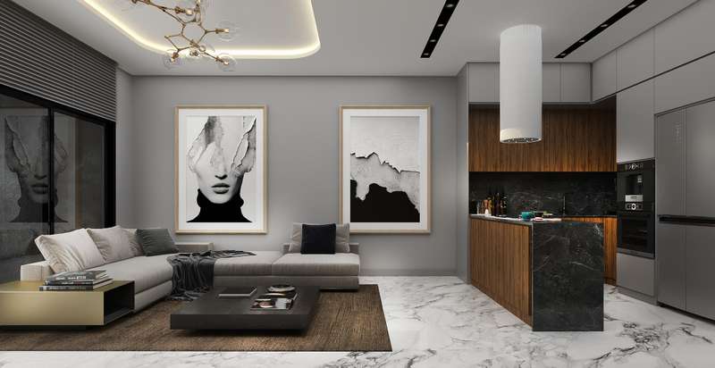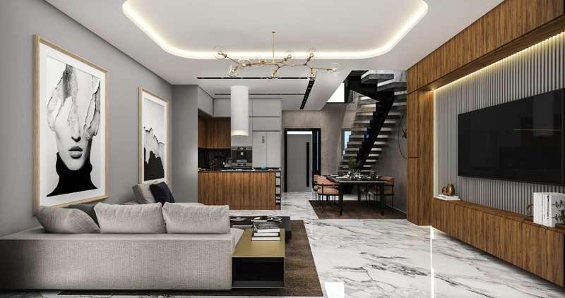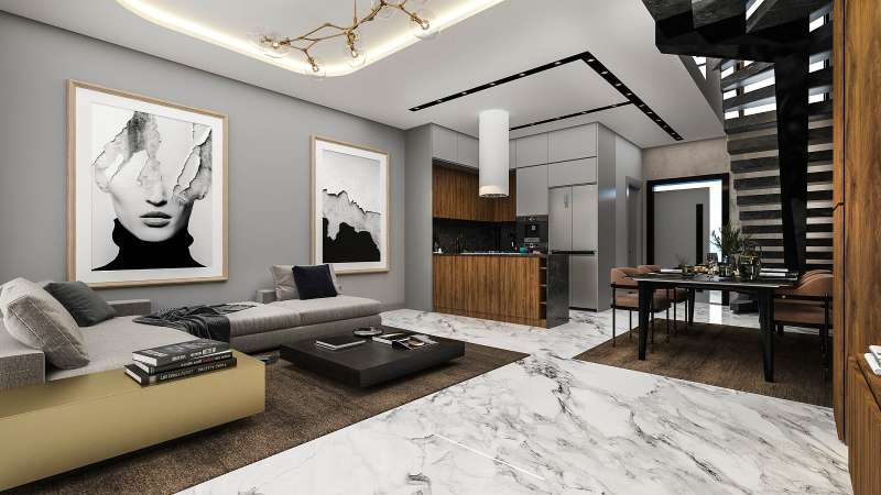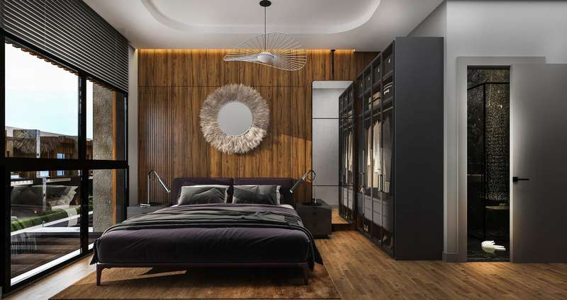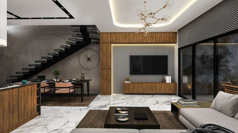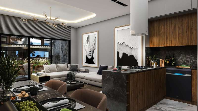 The villas for sale in Kusadasi Turkey have an open plan kitchen, 3 bedrooms, living room, garden terrace, balcony, en-suite bathroom, and shared bathroom. They are equipped with features such as smart home security system, natural gas underfloor heating, energy-saving aluminum joinery window systems, air conditioning infrastructure, wooden and ceramic floor coverings.