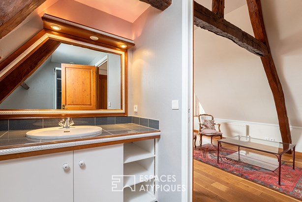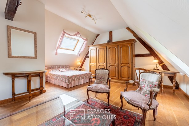 One of them features an exterior staircase typical of Norman houses, providing direct access to a terrace. A second bathroom completes this level.