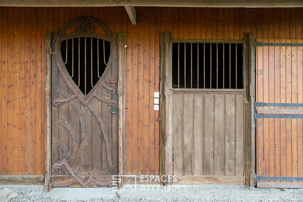 The main house opens onto a spacious 37 m2 living room, flanked by a large stone fireplace from a castle and a wood-burning stove framed by oak beams. A separate 18 m2 kitchen, furnished in a rustic style and equipped with high-end appliances, extends into a functional utility room.