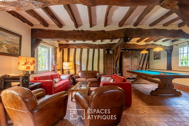 A billiard table blends harmoniously into the space, conducive to conviviality. A second 43 m2 living room with a brick fireplace provides a cozy atmosphere, while a first bedroom on the ground floor, accompanied by its bathroom, offers comfort on one level.