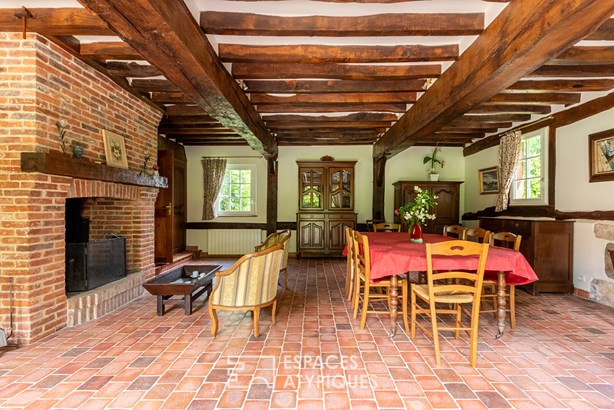 The first, a 148 m2 half-timbered house, has retained its old-world charm with its exposed beams, stone fireplaces, and warm atmosphere. The second, a former 18th-century wine press, has been renovated into a 231 m2 independent dwelling, in an authentic style, combining high-quality materials and generous volumes.
