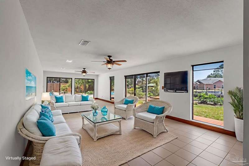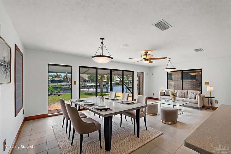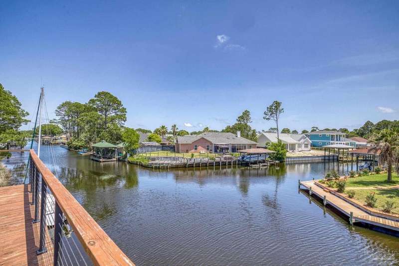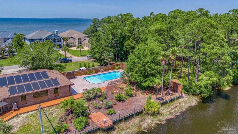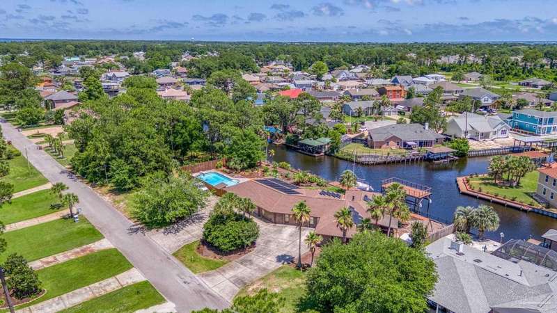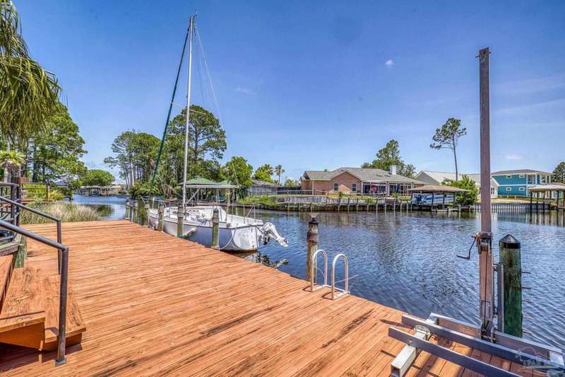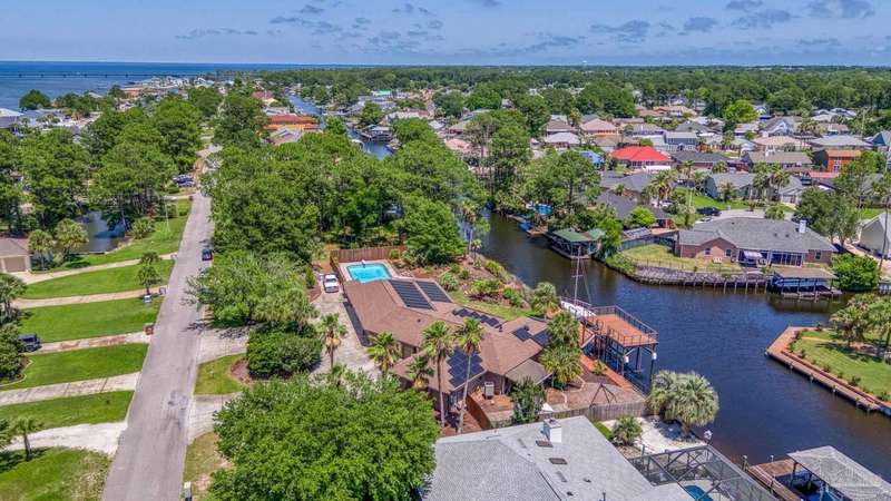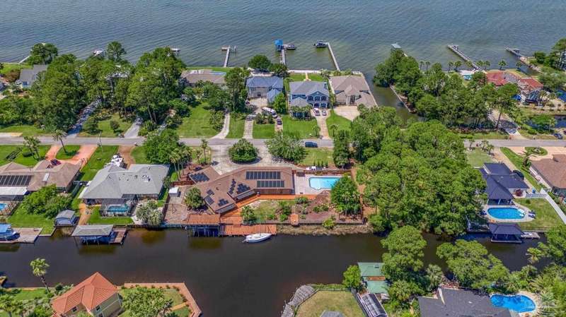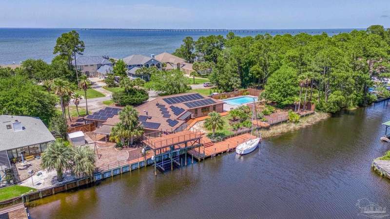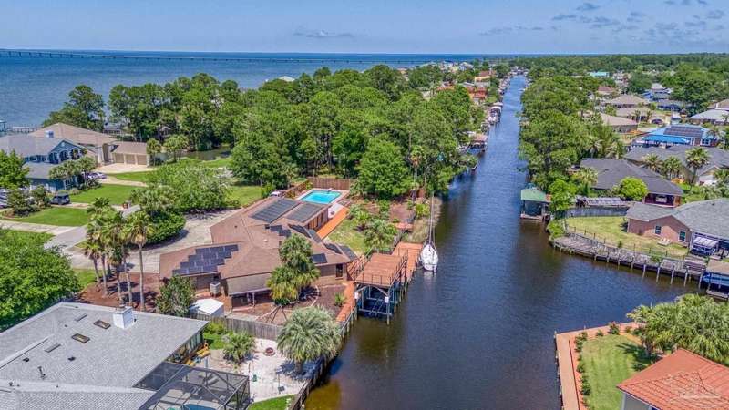 SELLER OFFERING 3 POINT RATE BUY DOWN TO HELP YOU GET PERMANENT RATES UNDER 6% ON THIS ONE OF A KIND DEEP WATER CANAL FRONT HOME! Over 3500 Sq Ft One Owner Home situated on 200' of deep water canal frontage, creating a sprawling homesite on over half an acre. Large Living Room that features a wood burning Fireplace and brick hearth. Solid Porcelain Tile through the living areas. A breakfast nook leads to a spacious kitchen, with Kraftmaid Cabinetry, solid surface countertops, touchless faucet, under cabinet and recessed lighting throughout, and an Island with Prep Sink overlooking the Dining Room and the Canal. The Primary Suite overlooks the canal, with Hardwood Floors, a large walk in closet, an attached bath with 2nd closet, solid surface shower, and countertops. A separate wing of the house holds 3 large bedrooms and a bath, accented by a clawfoot tub from NOLA.The 5th bedroom is currently set up as an office, with 3rd full bath access. You'll also find a huge rec room, that leads out to a Solar Heated Saltwater Pool, with new Liner! There's also a fire pit and fish pond. From the pool there's WearDeck Composite decking across the back of the house and leading to the boathouse with 8000+ lb lift, Jet Ski Lift, with a large raised Deck that overlooks the canal, plus deep water dockage. There's also a separate area with a storage building and open area for kids or pets. Enormous 4 car garage, with workshop space, and plumbed for a 4th bath. The house has been well maintained and updated with lots of Smart Home Features: Bluetooth whole house intercom, wifi connected thermostats, variable speed pool pump, Heat pump with built in ionizer, expandable irrigation system on well, plus comfort features like LED lighting w/night light settings, solar blinds, and whole house solar system that provides $35 a month power bills!