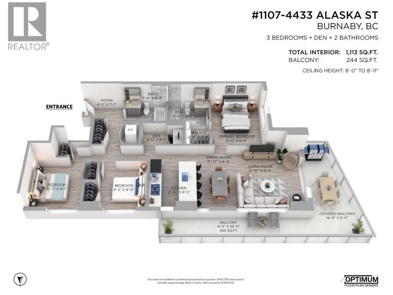 The highest 3-bed + Den corner residence of this floor plan at ALASKA by Amacon-Burnaby's 2024 flagship address. This 1,113 sq.ft. 3 Bed / 2 Bath home features an expansive 244 sq.ft. wraparound patio, offering seamless indoor-outdoor living rarely found in new construction. With ceiling heights ranging from 8'0" to 8'11", the home feels bright and airy from every angle. Enjoy integrated stainless steel appliances, forced air heating/cooling, and premium finishes throughout. The ALASKA building is loaded with amenities including a fitness centre, business hub, and outdoor lounges. #1107 represents a rare opportunity to secure a corner, upper-level 3-bedroom home in Burnaby´s Brentwood neighbourhood-perfect for upsizers, downsizers seeking space, or families looking for space! (id:58403)