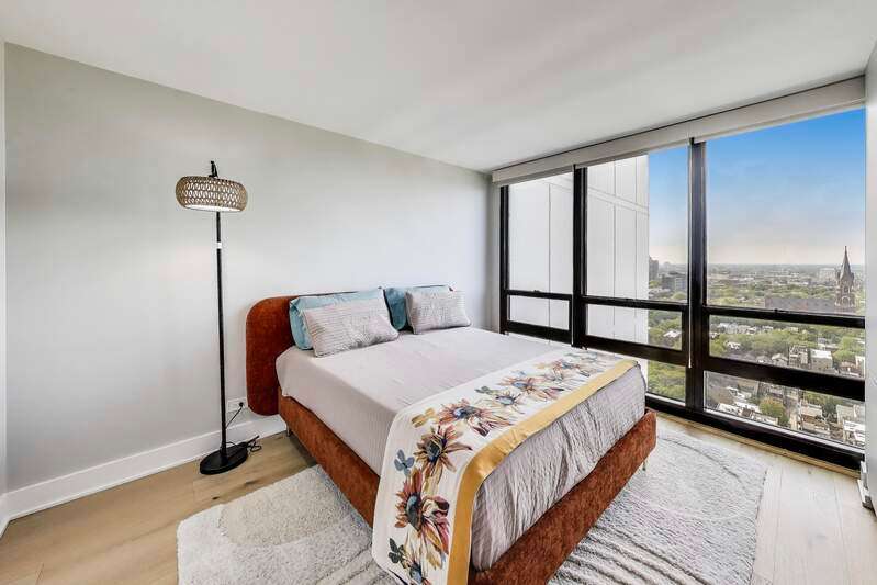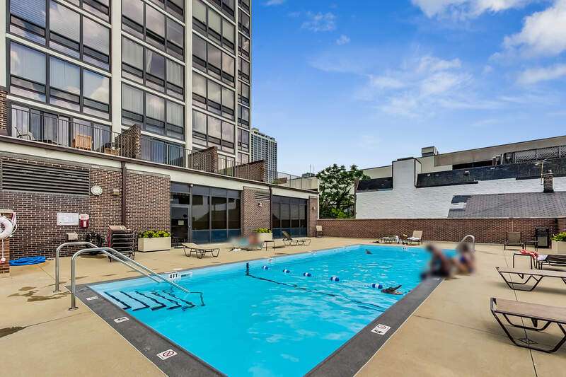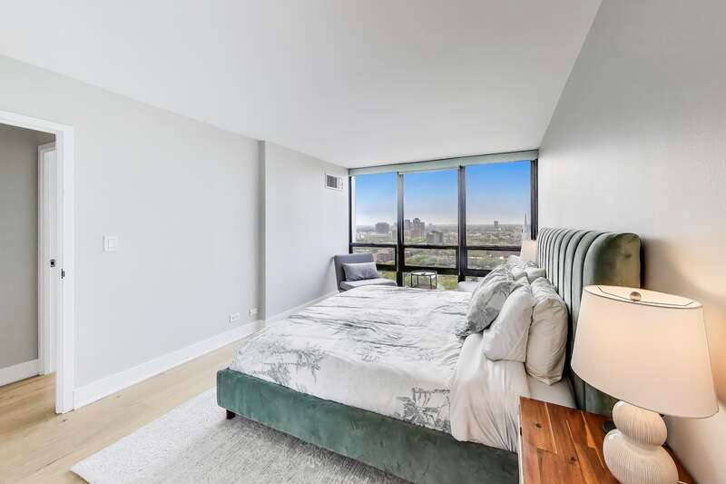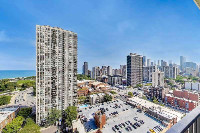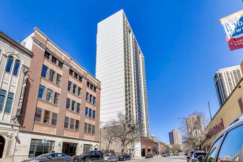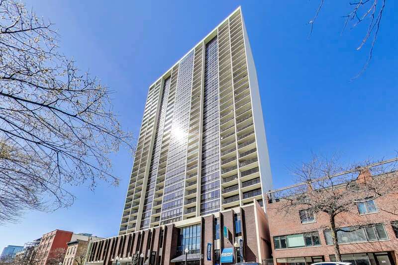 Recently updated and perfectly located in the heart of Old Town! This spacious 2 bed/2 bath on a high floor offers stunning east-facing views from your large private balcony, along with dramatic west-facing city and sunset views from both bedrooms. The bright and airy living room features floor-to-ceiling windows, brand-new hardwood floors (2024), and plenty of space for a dedicated dining area. The open-concept kitchen was recently renovated with new cabinetry, granite countertops with island seating, and stainless steel Kitchenaid appliances. The primary suite includes an en suite bath, while the generously sized second bedroom is complemented by a renovated bath with walk-in shower. Excellent closet space and new window treatments throughout. Full-amenity building offers outdoor pool and sundeck, fitness center, bike room, 24-hour door staff, hospitality room, dry cleaners, plus rental storage and parking options. Assessments cover heat, A/C, cable, and internet. Incredible location where you can walk to everything-Wells Street dining, nightlife, and shopping are right outside your door. Just steps to the lakefront, Lincoln Park Zoo, Second City, Green City Market, North Avenue Beach, and public transportation!