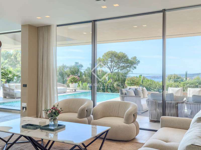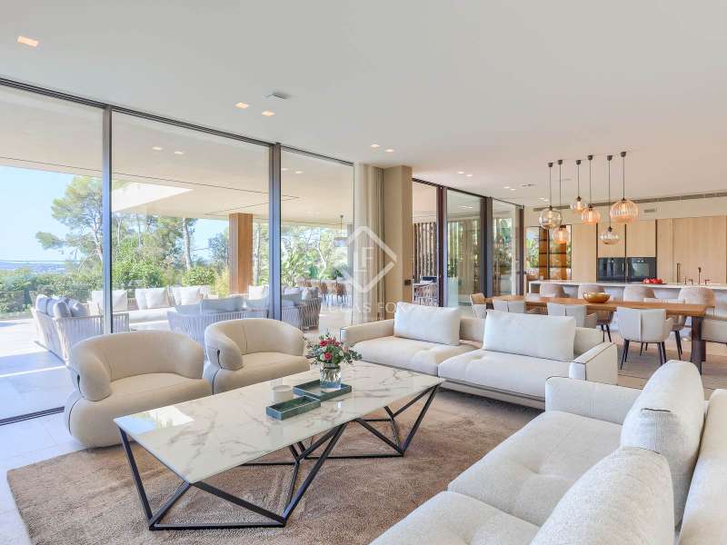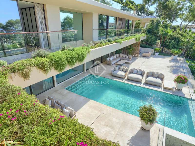 This newly built modern villa is unlike any other in Portals Nous, one of the most prestigious locations in the southwest of Mallorca. Set on a generous landscaped plot, the property offers a rare combination of privacy, architectural elegance, and contemporary Mediterranean style, creating a residence of true distinction. From the outset, this home sets itself apart. Designed by a prestigious architectural team, it embodies modern sophistication with open-plan interiors, floor-to-ceiling windows, and seamless transitions between the living spaces and the outdoors. The villa’s unique double-access design underscores its exclusivity: a discreet rear entrance leads directly to the bedroom level, while the impressive lower-level entrance reveals a standout feature – an expansive garage with exceptional capacity, complemented by a fully equipped gym, private spa, and wine cellar. Across its three levels, the villa offers seven bedrooms and eight bathrooms, each designed for comfort and independence. The primary suite crowns the upper floor with panoramic sea and mountain views, walk-in wardrobes, and a spa-style bathroom with freestanding bathtub. Additional suites on each floor ensure maximum privacy for family and guests, with one opening onto its own terrace and two located on the lower level – ideal for extended stays or visitors. The outdoor areas have been designed as extensions of the living space, centred around a striking saltwater infinity pool surrounded by landscaped gardens, sunbathing terraces, and dining areas. A covered terrace with a fully equipped summer kitchen provides the perfect setting for entertaining year-round in complete seclusion. Every detail has been carefully considered, from the lift connecting all floors to the underfloor heating, air conditioning, and premium finishes. The result is a unique property that combines scale, elegance, and privacy, offering not just a home but an unparalleled lifestyle in one of Mallorca’s most coveted addresses.