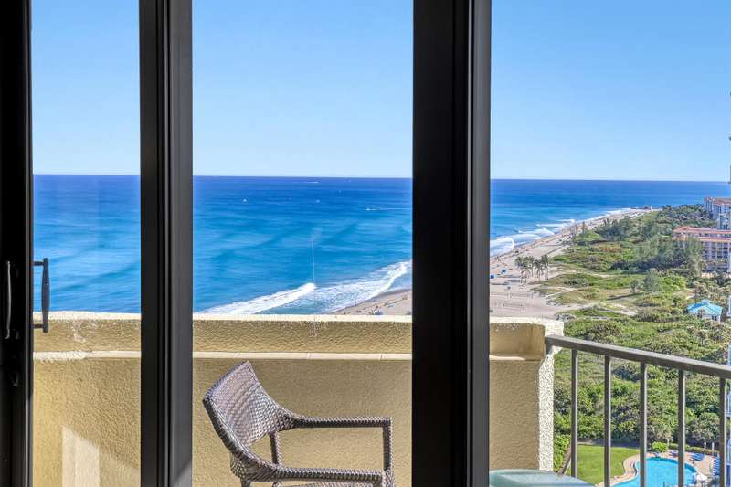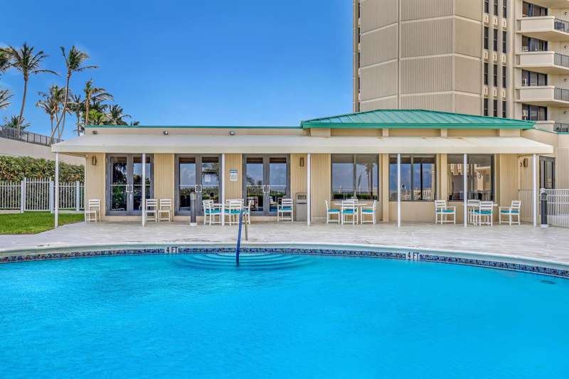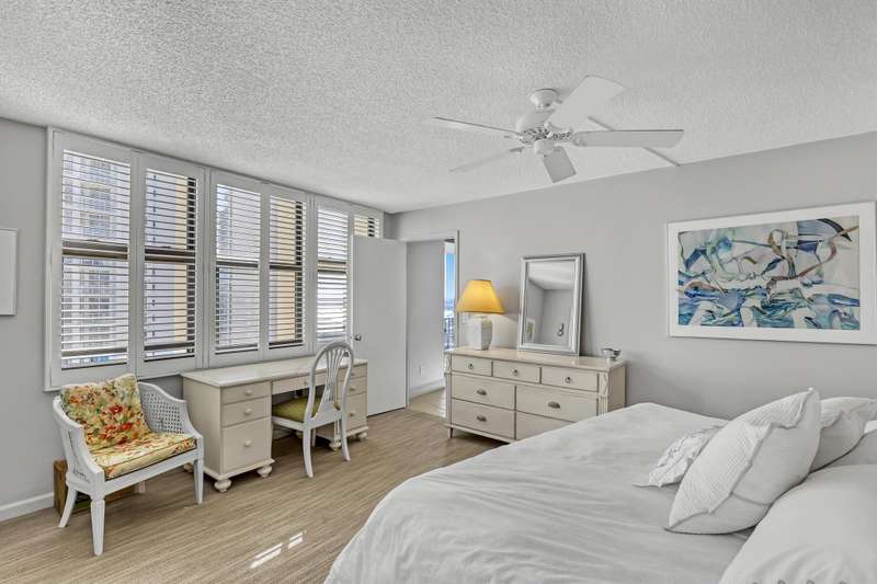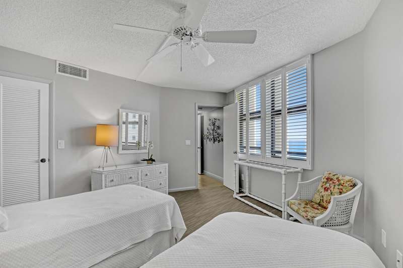 Southeast exposure with stunning ocean to intracoastal views, wide sandy beach. Furnished 2/2 split floor plan unit. Updated open kitchen, stainless steel appliances. Tile flooring in living and dining room with carpet in both bedrooms. Walk in closets.2 zone AC units. Window treatments plantation shutters in bedrooms. Impact doors and windows, Gated community, cover parking, pool, gas grills, tennis, pickleball, fitness center, washer/dryer on each floor, gated beach access. Close to the Ocean Mall. Sold furnished.