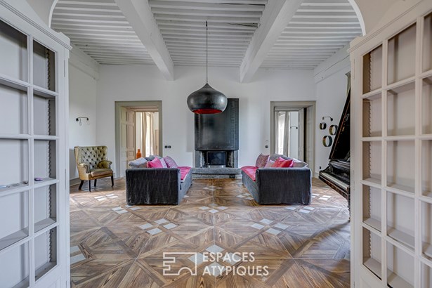 Situated on the first floor, this majestic 163.90 sqm flat with its French ceilings and alcove windows welcomes you from its 10.70 sqm covered terrace into an attractive entrance hall with guest toilet. A fanlight passageway, clad in original moulded wood panelling, opens into a magnificent living room with a fireplace topped by a steel 'gunmetal' mantle that subtly echoes the hanging lamp opposite.