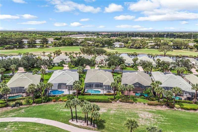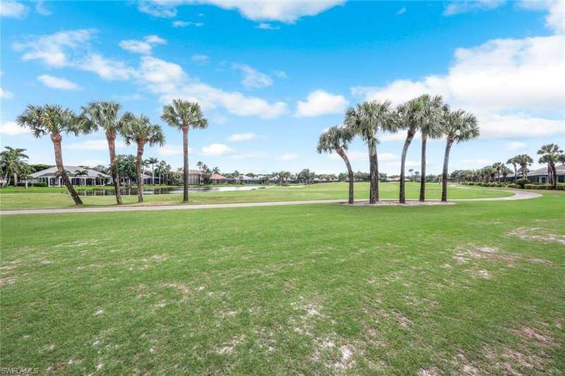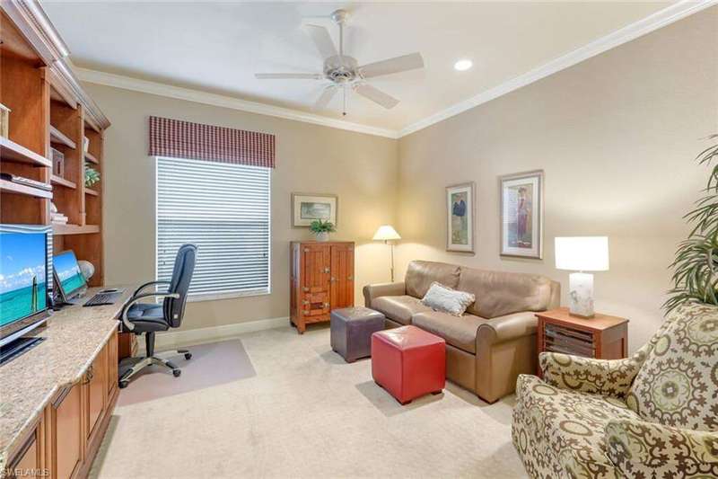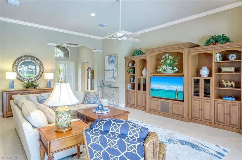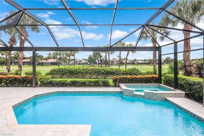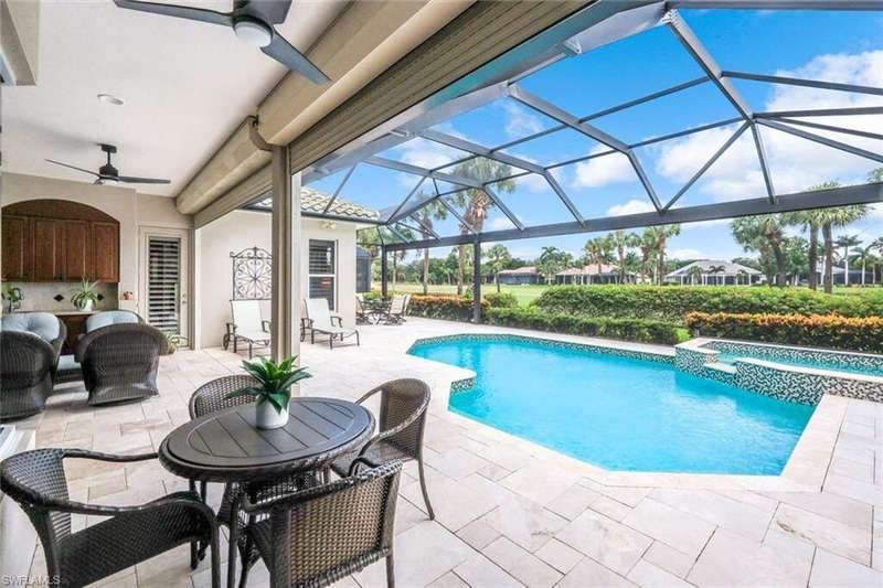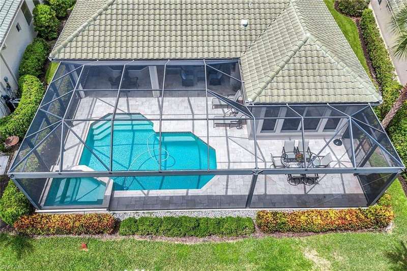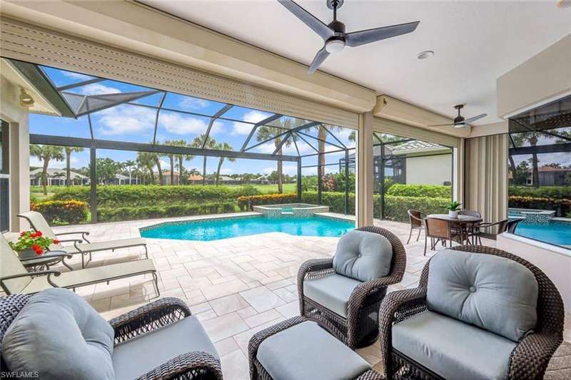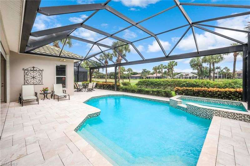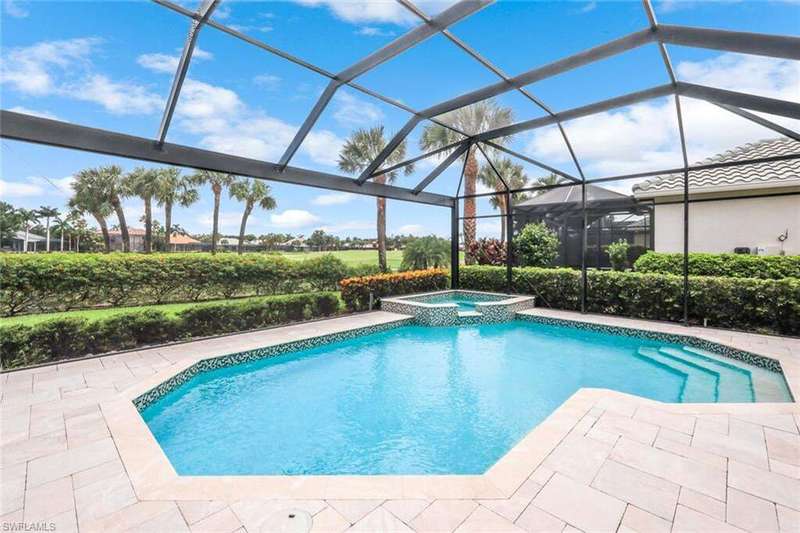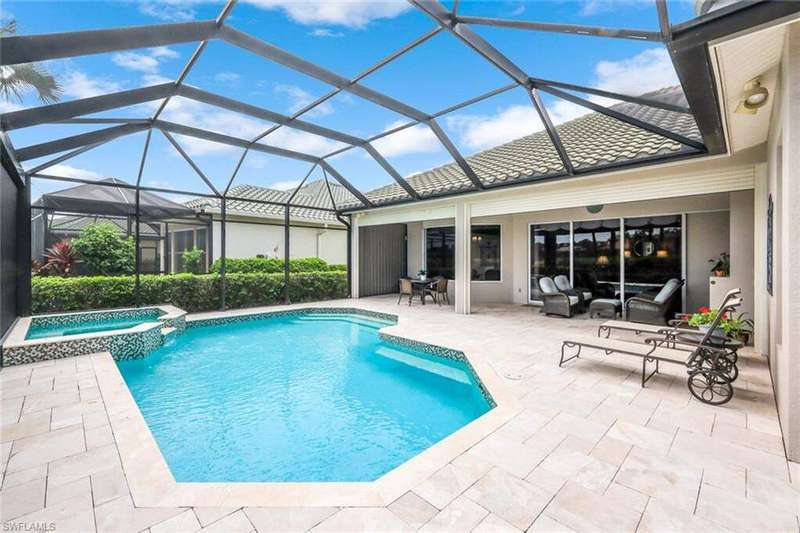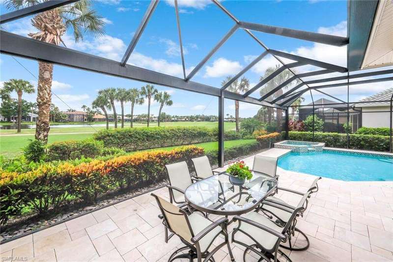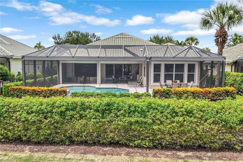 Rarely available and highly sought-after, this Bardmoor II floor plan is offered with an OPTIONAL FULL-GOLF MEMBERSHIP and features 3 bedrooms plus a den, 2.5 baths, an oversized 2.5-car garage 20 x 29, and an additional 6 X 10 FOOT AIR CONDITIONED STORAGE ROOM in garage ideal for crafts or extra storage and a 2020 NEW ROOF. Southern exposure enhances the beautifully renovated pool, spa and natural stone decking that expands the width of the home with the extended picture-screened lanai spanning the full width of the home and providing seamless lake and golf course views and 2023 pool heater. The NEW lanai also features electric storm hurricane protection, allowing for a convenient lock-and-go lifestyle. The open great room floor plan showcases volume ceilings, abundant natural light, and a custom craftsman-style entertainment center. The fantastic kitchen is perfect for entertaining family and friends, complete with a morning room breakfast area overlooking the pool, natural gas cooking. The den includes an impressive built-in with generous storage and workspace. The primary suite offers 2 walk-in closets, along with a spacious bath featuring a soaking tub and walk-in shower. Additional highlights include tile flooring throughout the main living areas and a utility room with sink. Ideally located near shopping, the airport, and Naples' beautiful beaches, this home is offered with an optional full golf membership. Shadow Wood offers optional Club Memberships with 3 / 18 Hole Championship Golf Course, 9 Har-Tru Clay Tennis Courts, 3 Bocce Ball Courts and beautifully landscaped community for walking and biking. COMING SOON to Shadow Wood- RESORT POOL, DEDICATED KIDS POOL, POOLSIDE DINING AND BEVERAGE SERVICE AND 6 INDOOR PICKLEBALL COURTS. The Commons Club Membership offers Beach access, Private Beach Club and Pavilion, Attended Fitness center with classes and on-site fitness trainers, Pickleball, Social activities and private restaurant on-site, Playground, Lap-pool and Spa, Massage and Spa Services by appointment. Come Live Your Best Life in Shadow Wood.