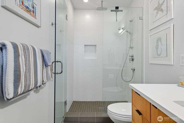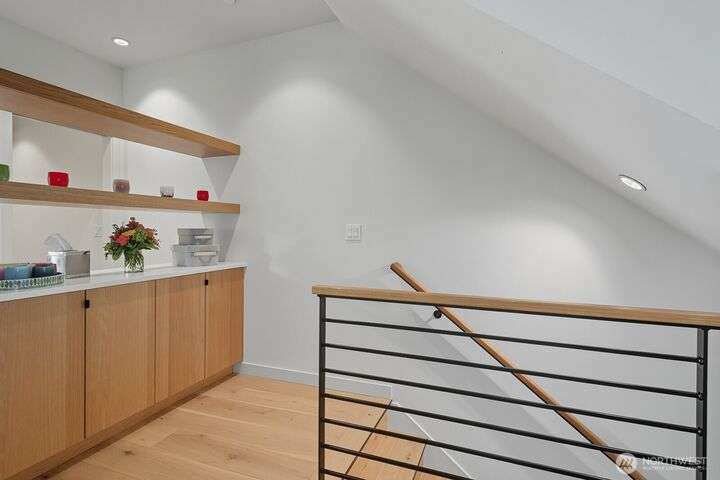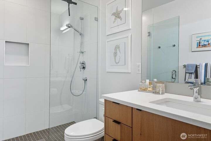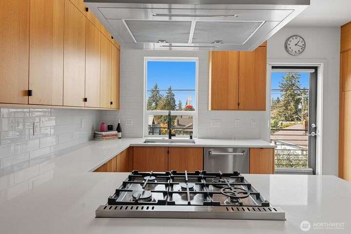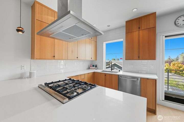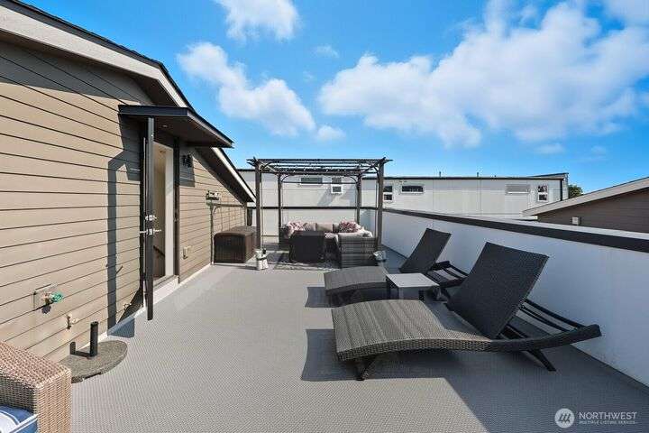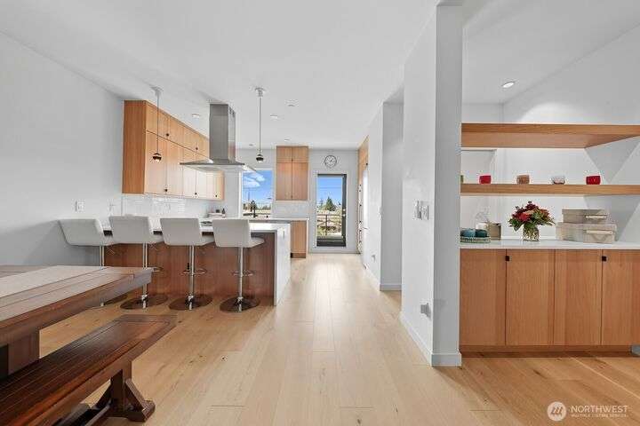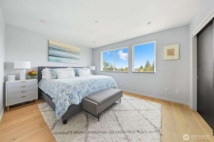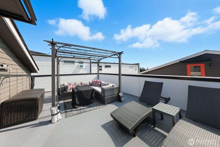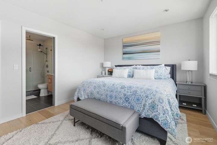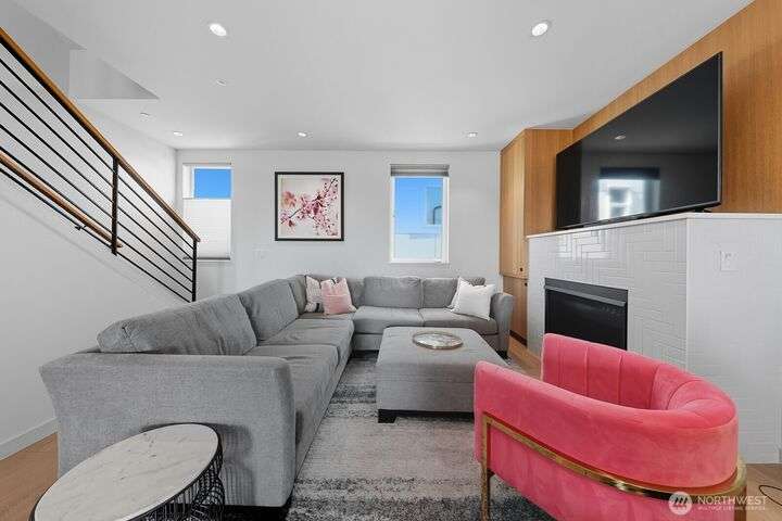 Tucked away from the street for added privacy,this fabulous townhome offers views of Mount Rainier,the Space Needle,and Olympic Mountain sunsets.The stunning chef’s kitchen features quartz countertops,oak cabinetry and a breakfast bar, perfect for everyday living and entertaining.The open-concept living and dining area enjoy a cozy gas fireplace and a private deck.Each of the 3 bedrooms includes its own en-suite bathroom, with two featuring heated floors.White oak hardwoods, refined built-ins, and museum-quality lighting add to the home's thoughtful design.Cap it all off with a large rooftop deck—ideal for entertaining or simply relaxing while taking in the city skyline.Prime location just steps from shops, cafés,grocery stores and parks.