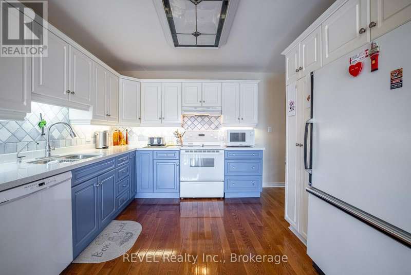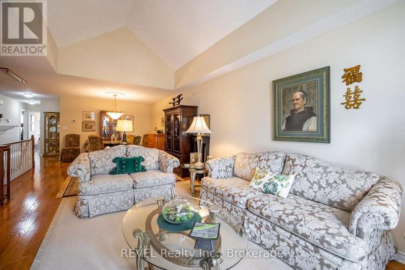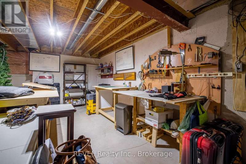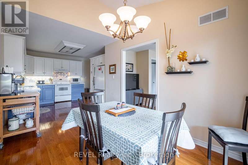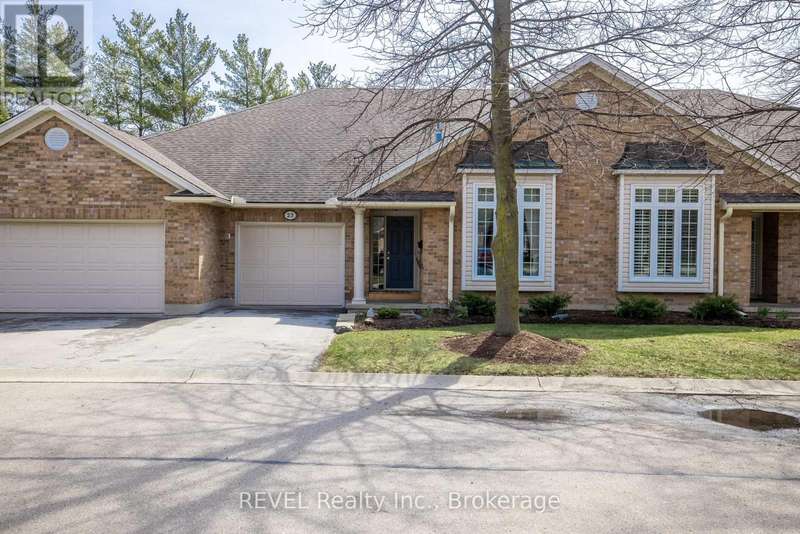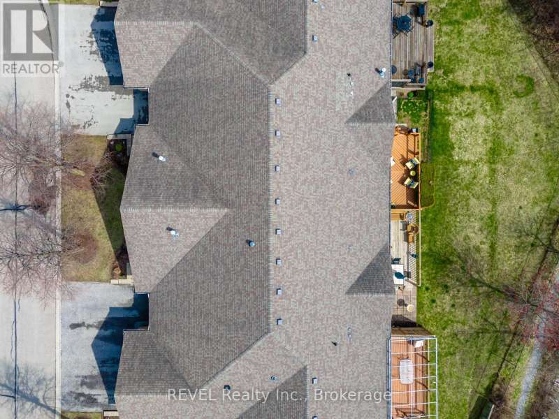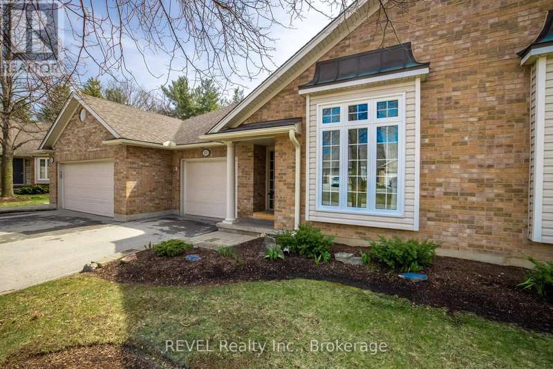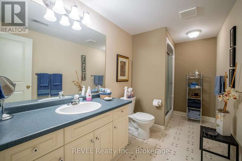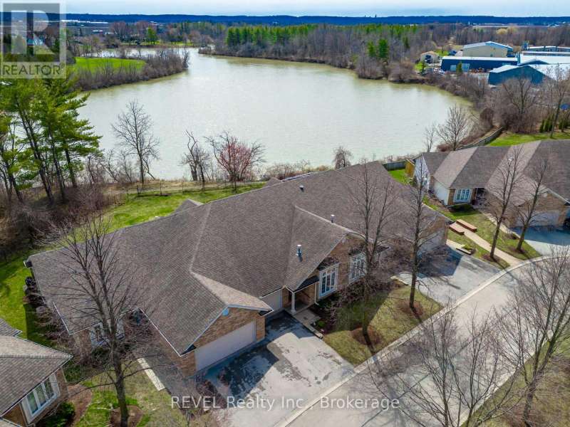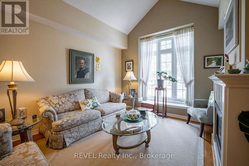 Welcome to this meticulously cared-for brick bungalow in Glen Brooke Estates, offering 1,360 sq ft of elegant main floor living in the heart of Niagara-on-the-Lake. The main level features a bright and spacious living room with cathedral ceilings and a cozy gas fireplace, a separate formal dining room, and a generous kitchen with Corian countertops, built-in dishwasher, and a charming dinette. Sliding doors lead from the dinette to a 20 x 12 wood deck, perfect for relaxing or entertaining. The primary bedroom boasts a walk-in closet and a private 4-piece ensuite. A second bedroom has been thoughtfully converted into a versatile den, study, or home office. There is also a convenient 2-piece bathroom off the dining room and main-floor laundry just off the kitchen. Direct access to the attached single-car garage adds ease and convenience. The finished lower level offers a large family room, a spacious guest bedroom, a 3-piece bathroom, and a substantial utility room with a new high-efficiency Lennox furnace and A/C. Additional features include a dedicated workshop, and storage area. Backing onto city-owned green space and a peaceful municipal reservoir fed by Four Mile Creek, this home combines natural beauty with low-maintenance living. Condo fees cover all exterior maintenance, lawn care, snow removal, building insurance, water costs, Bell Fibe Internet & TV. This well-maintained one-story townhome complex is highly sought-after in the vibrant community of Virgil. (id:7434)