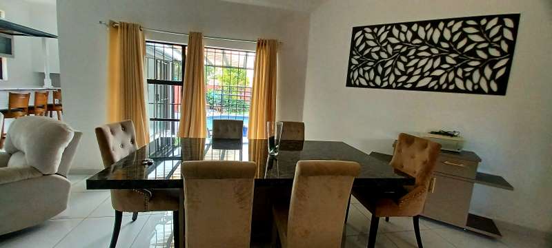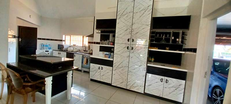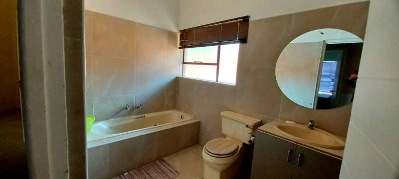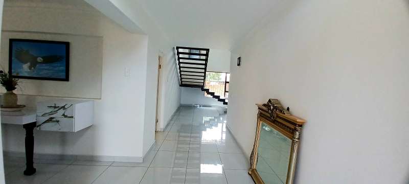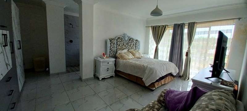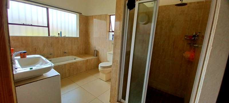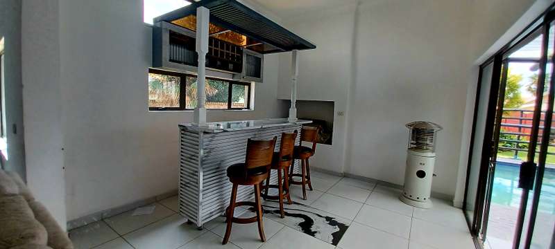 This stunning property speaks of style, luxury and space! It offers a welcoming entrance hall. A large family/TV room. Beautifull formal lounge. Dream kitchen with granite tops, separate scullery and laundry area. Ample packing space. Gas stove. Open plan dining room. Study. Bar area with glass sliding doors that opens up onto a sunny patio that overlooks a sparkling pool, and lapa with a build in braai. Downstairs you’ll find 4 spacious bedrooms, with build in cupboards. One bedroom with a walk in closet. 3 stunning bathrooms. Upstairs an extra large bedroom with en suite bathroom, balcony, and own kitchen. Extras: Store room. Domestic quarters. Double automated garage. Undercover parking for two more vehicles. Landscaped low maintenance garden. Property is newly renovated. Fully fenced and walled for your security. This is an absolute MUST SEE!! Close to all amenities. Call today for a private viewing!