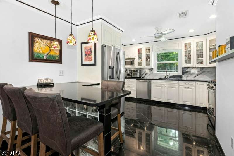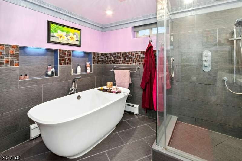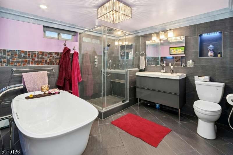 Welcome to this vibrant, move-in-ready home featuring a stunning modern kitchen with porcelain tile backsplash, granite countertops, stainless steel appliances, touch faucet, recessed lighting, heated floors, and a convenient breakfast bar. The kitchen flows seamlessly into the dining room adorned with crown molding, custom trim, a bright bay window, and recessed lighting for a warm, inviting atmosphere. Bedrooms on this level include double closets, crown molding, and stylish ceiling fans. Enjoy the sunlit family room/sunroom surrounded by glass windows, custom built-ins, and an elegant electric fireplace ? perfect for relaxing or entertaining. The luxurious bathroom showcases Italian marble and glass finishes, a no-threshold rain shower with frameless doors, heated floors, and a bidet with hot and cold water for spa-like comfort. The finished basement adds incredible living space with porcelain floors, a wet bar, mood lighting, gas fireplace, built-in closets, home office areas, and a stunning bathroom featuring a freestanding Victoria + Albert lava stone tub, walk-in shower, and heated floors. Exterior upgrades include fresh paint, new masonry, and updated railings. This home is truly move-in ready with exceptional finishes and thoughtful details throughout. Don?t miss your chance to own this beautifully upgraded property!