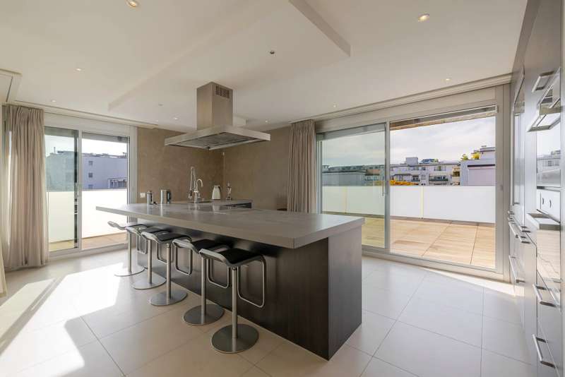 Situated in the sought-after Saint-Jean district, just a five-minute walk from the lake, this penthouse enjoys a privileged location in a quiet street, yet within easy reach of all amenities. Built in 2013, this contemporary building blends elegantly into an island of protected facades from the early 20th century, combining character and modernity. The attic boasts a superb U-shaped terrace that surrounds the entire surface and serves every room. This configuration creates a natural flow between interior and exterior, bringing light and brightness to every space. The main room features a large living room, a fully-equipped open kitchen and a dining area, providing a pleasant and functional living environment. The sleeping area features two en suite bedrooms, each with dressing room and private bathroom, ensuring comfort and privacy. A closed box garage able to accommodate two vehicles, in addition, as well as a cellar, complete this property. With its central location in a quiet street, its contemporary architecture, its large terrace and its meticulous finishings, this penthouse represents a rare opportunity for people looking for a quality property in the heart of Geneva.