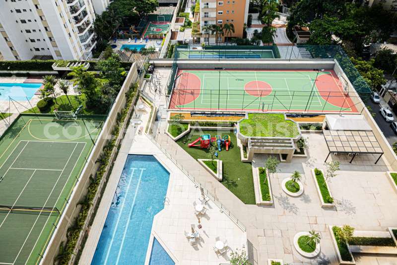 Condomínio clube com quadra de tenis coberta, quadra de squash, academia e piscina com serviços de clube.