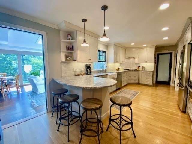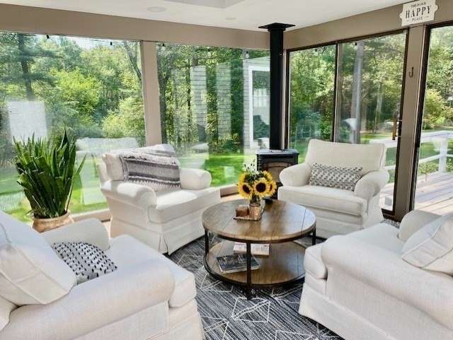 Nestled on a generous 1.38 acre lot this lovely residence presents an exceptional opportunity within a highly desirable neighborhood. The family room is a captivating space, distinguished by its vaulted, and beamed ceiling which draws the eye upward, creating an expansive atmosphere, while a fireplace adds warmth and character, complemented by custom built-in display shelves. In the kitchen, light, shaker-style cabinetry and stone countertops establish a sophisticated culinary workspace; the kitchen peninsula configuration creates a functional layout for both preparation and casual dining, while the gas stovetop and double oven support everything from simple meals to elaborate feasts. A wonderful open floorplan leads to a cozy sunroom with walls of glass overlooking the serene and manicured grounds. This home offers updated systems, central air conditioning and beautiful spaces to gather family and friends. A truly special home and neighborhood, ready to welcome you!