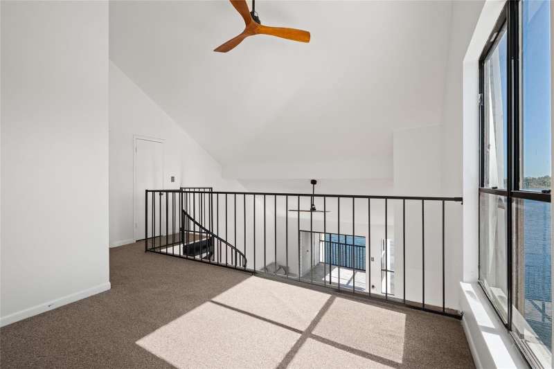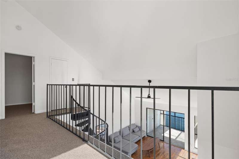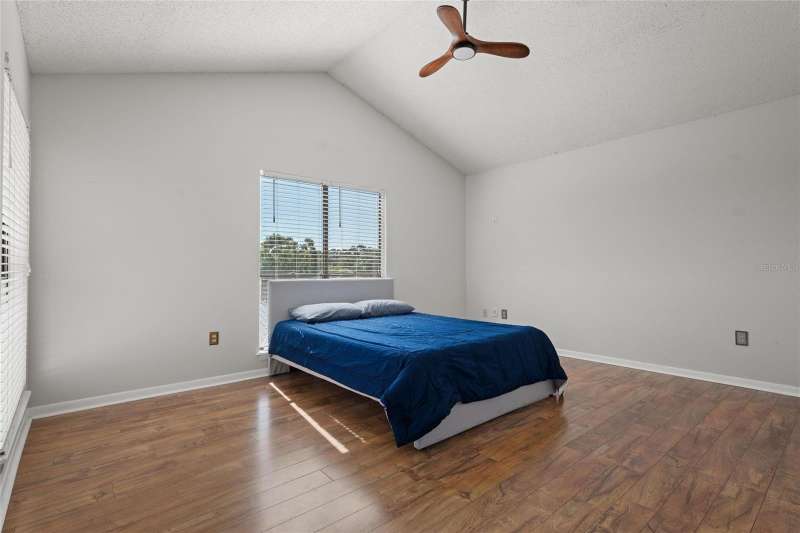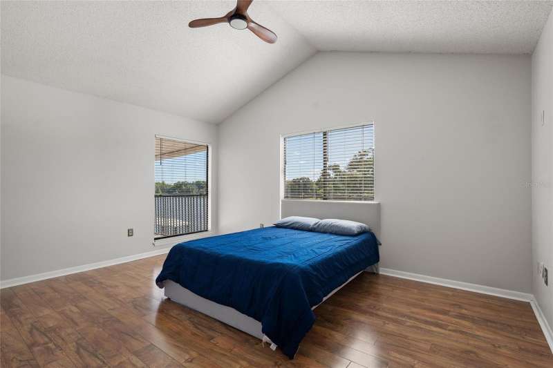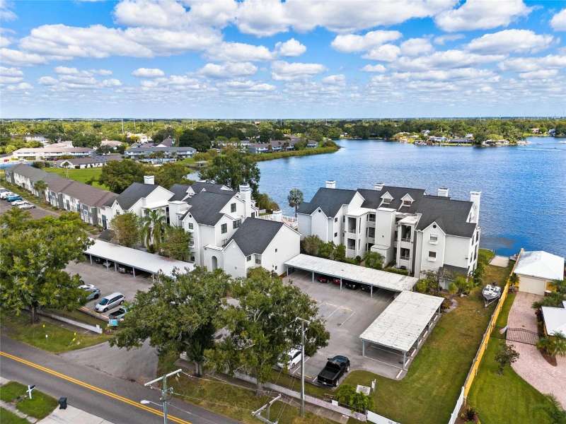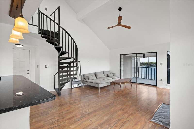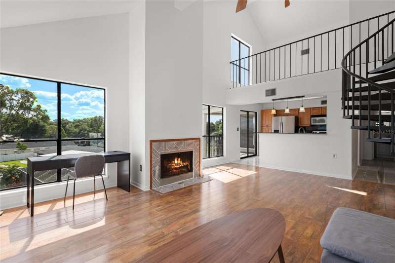 Enjoy lakefront living at its best in this warm and welcoming end-unit, Tampa condo with soaring ceilings and picturesque views of Egypt Lake. Step inside to a bright, open floor plan featuring a stunning fireplace with custom tile surround, vaulted ceilings, and a spacious living area filled with natural light and serene water views. The kitchen, wide open to the family room, makes this home perfect for entertaining or relaxing evenings in. The kitchen features tile flooring, rich wood cabinetry, granite countertops, stainless steel appliances, and a breakfast bar for casual dining. Glass sliders open to a private balcony overlooking Egypt Lake — ideal for morning coffee or evening cocktails. An inside laundry area with stackable washer and dryer adds convenience. The primary bedroom offers a peaceful retreat with wood floors, large windows, vaulted ceilings with a fan, a walk-in closet, and a private ensuite bathroom with dual sinks and a large tub/shower combo. The secondary bedroom also features wood flooring, a ceiling fan, and a bright window with blinds. A spiral staircase leads to a carpeted, open loft and bonus room with closet — perfect for a home office, gym, or potential third bedroom. With modern finishes, flexible living spaces, and sweeping lake views, this home offers a truly inviting Tampa lifestyle. Community amenities includes a dock, boat ramp, and pool, so you can enjoy the best of Florida lakefront living right outside your door.