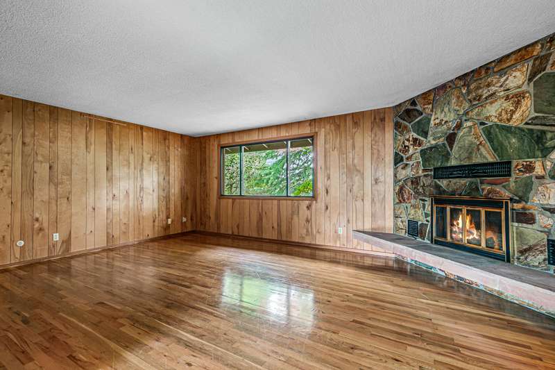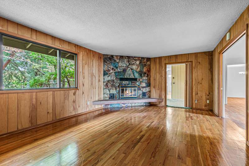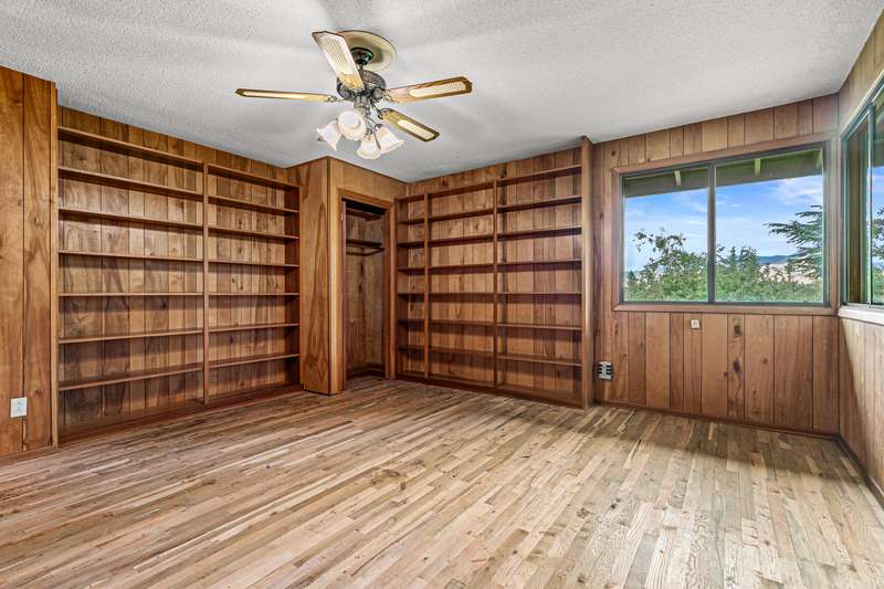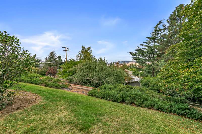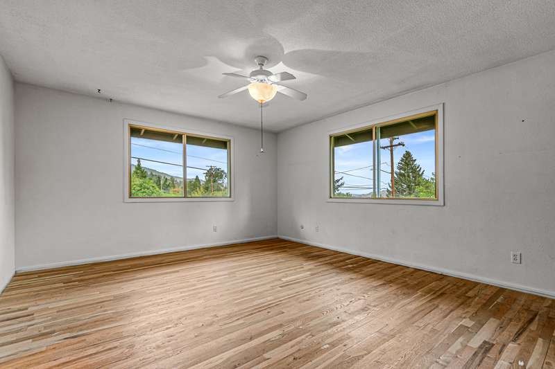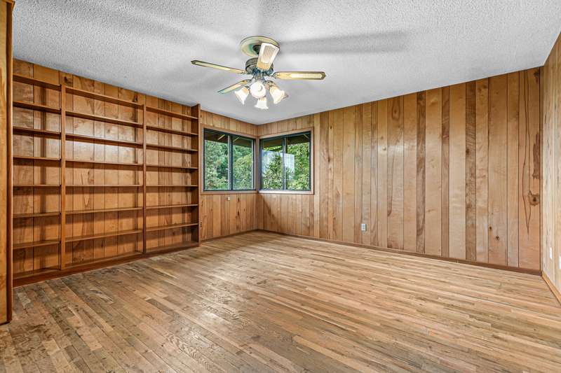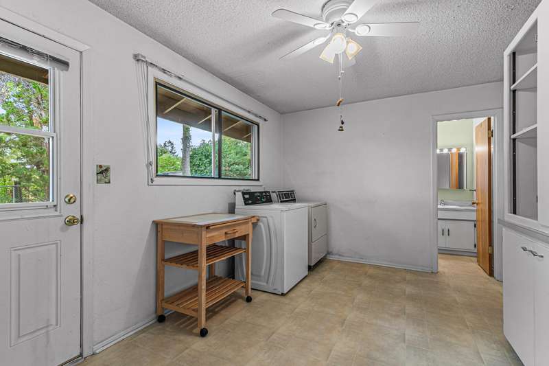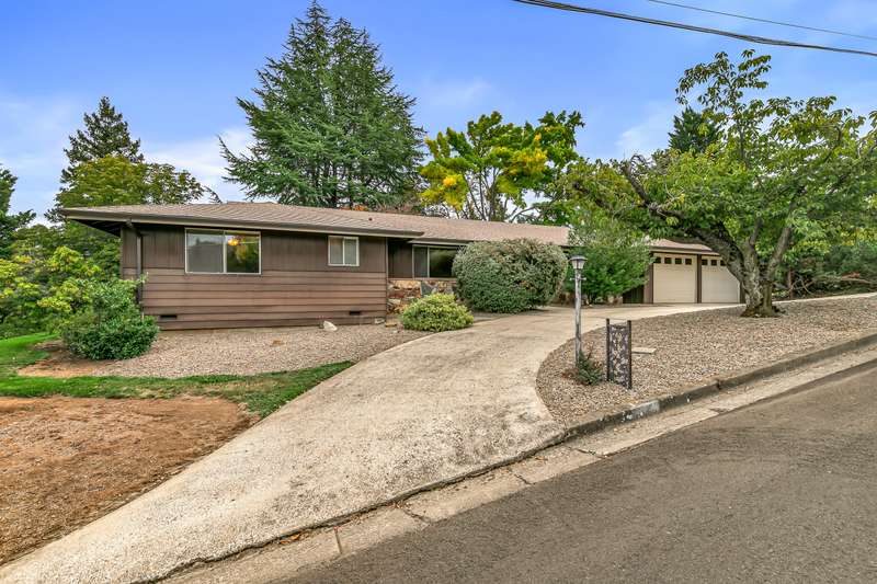 Charming single-level midcentury home on a huge 0.4-acre lot with mature trees located above the boulevard, just nine minutes to Ashland's downtown plaza! Versatile floor plan with original oak hardwood floors, front living room and formal dining room, informal dining area with built-in buffet and sliding glass door to covered brick patio. Kitchen with wood cabinets, stainless double sink, electric range oven with hood, second oven, dishwasher, and refrigerator. Primary bedroom with ceiling fan, dual closets, and ensuite access to full bathroom with tiled vanity, vintage fixtures, and sunken tub shower with tiled surround. Second bedroom or office with built-in shelving, closet, and ceiling fan. Family room or potential third bedroom with wood-paneled walls and wood-burning fireplace with stone surround. Pantry mudroom with built-in cabinets, washer, dryer, exterior door to backyard, full bathroom with shower, and two-car garage with insulated bay doors. Inquire for details!