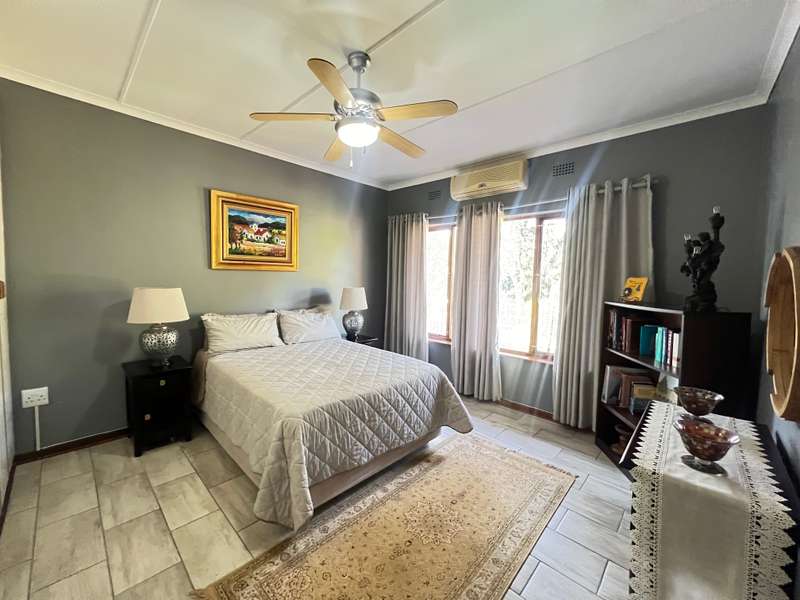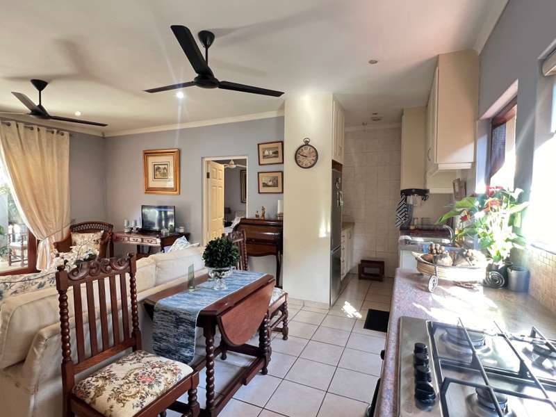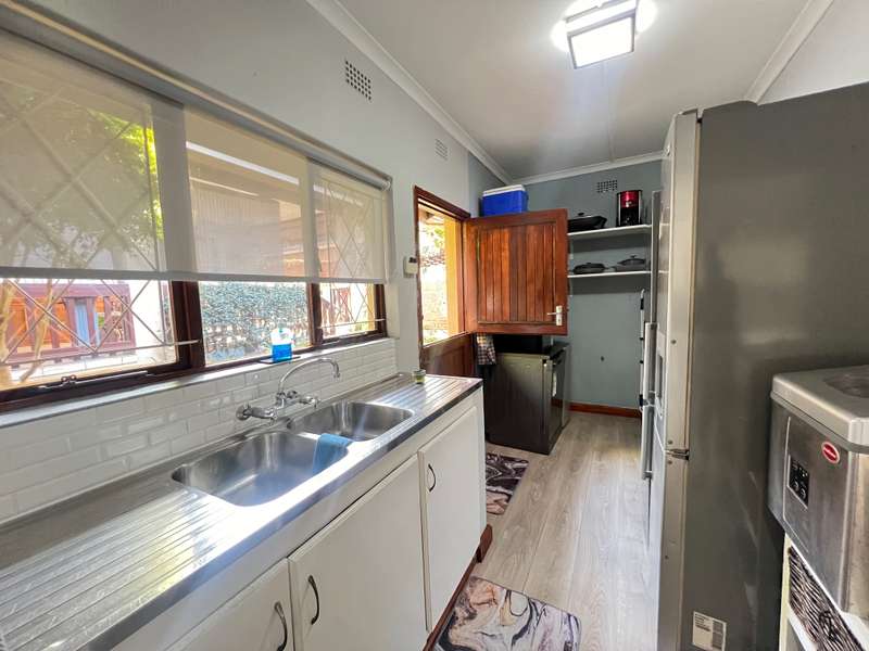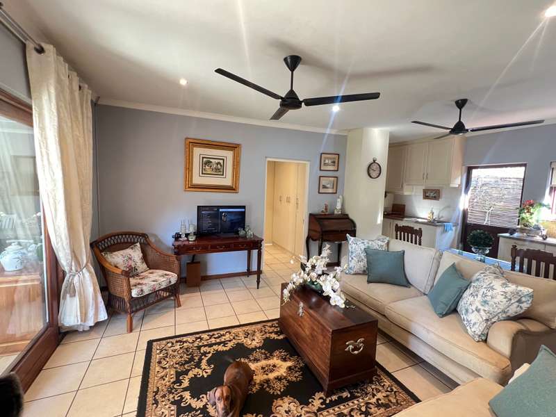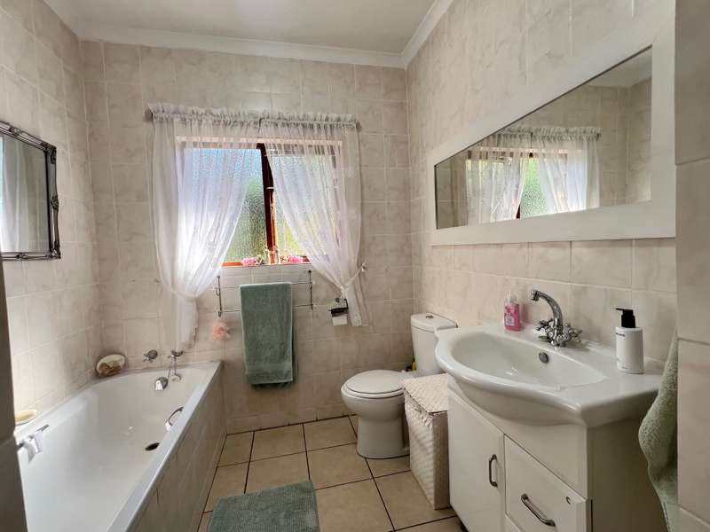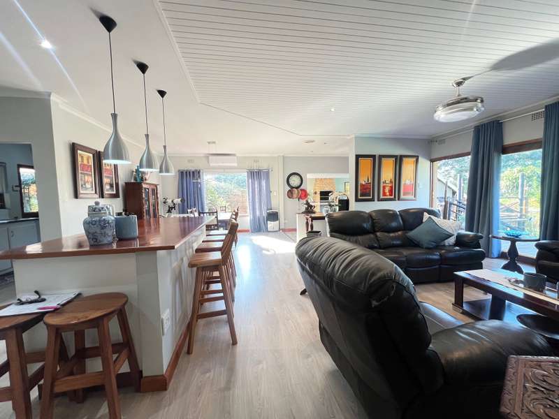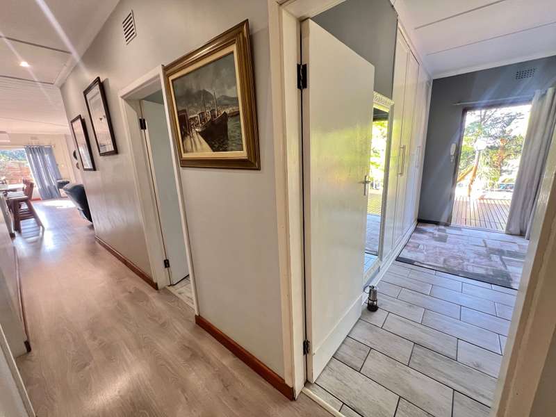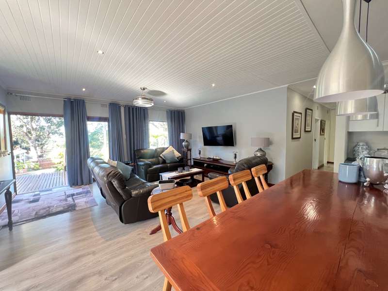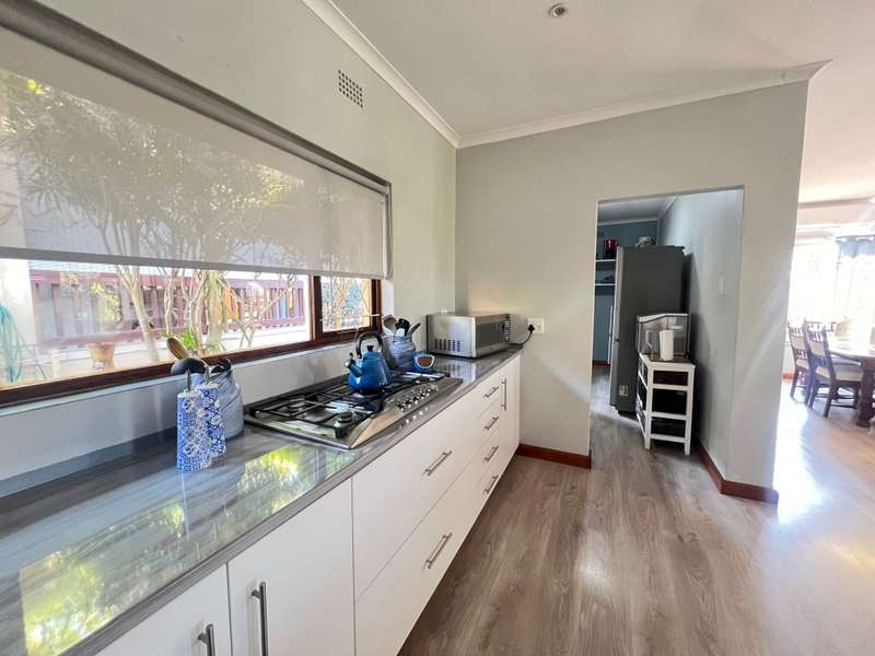 This exceptionally well-maintained, single-level property features a 3-bedroom, 2-bathroom main house and a separate 2-bedroom, 2-bathroom Garden Cottage, all situated on an expansive plot. The home boasts a large deck, an enclosed patio with a built-in braai, perfect for entertaining by the swimming pool. The kitchen includes an island, a gas hob, an electric oven, and a scullery/laundry room. The open-plan kitchen seamlessly connects to the hallway leading to three bedrooms and two bathrooms, including a main en-suite. Additionally, there's a study with access to the back garden. The property is equipped with a comprehensive off-the-grid solar system featuring 13 panels, an inverter, a Hubble battery, water tanks, and a 6kVA generator with a change-over switch. 3-phase Electricity installed. Outdoor amenities include a large swimming pool, three automated garages, a boat carport, and two separate automated gates. The property is secured with electric fencing, an alarm system with infrared motion sensors, and five water tanks. The beautifully landscaped garden adds to the property's charm.