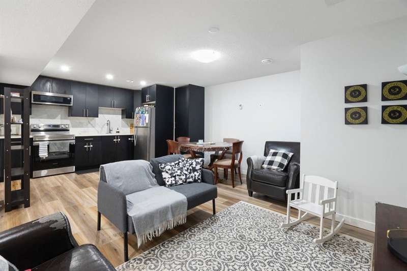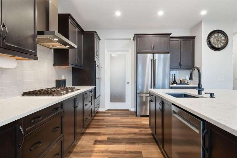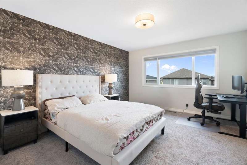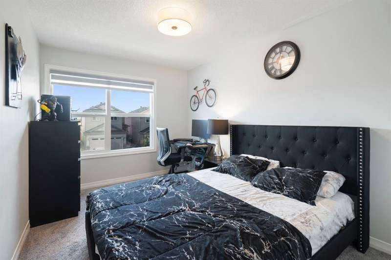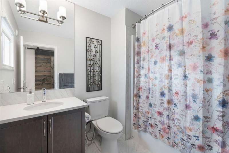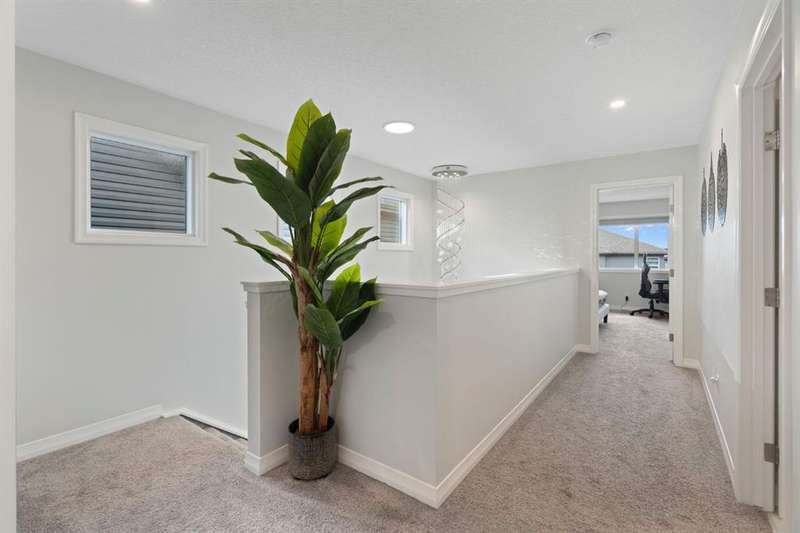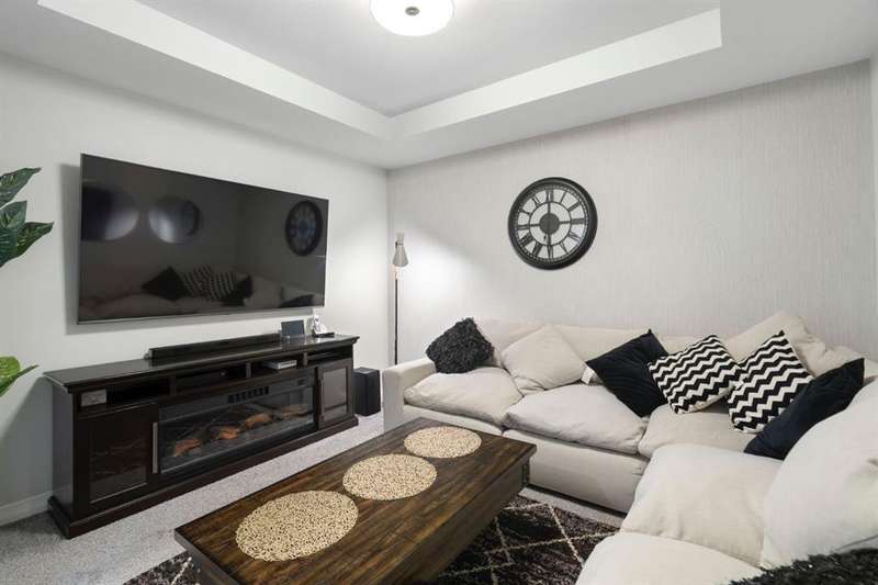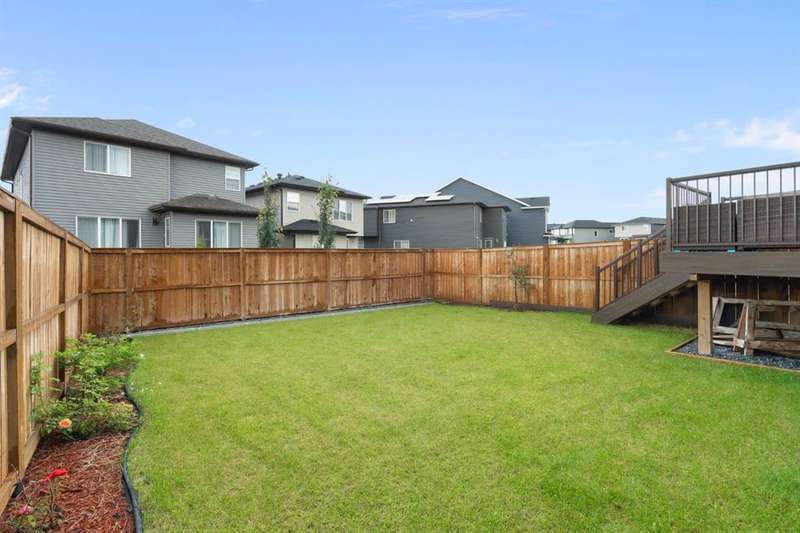 Welcome to this beautifully appointed 2-storey home with a legal basement suite in the vibrant community of Cornerstone perfect for families, multi-generational living, or those looking for an income opportunity. Offering over 3,300 sq ft of living space, this home combines thoughtful design, stylish upgrades, and energy-efficient features for a truly exceptional lifestyle. From the moment you step inside, you’re greeted by a bright, open main level with soaring ceilings and large windows that fill the space with natural light. The executive kitchen is the heart of the home, showcasing a massive upgraded quartz island, premium cabinetry, stainless steel appliances, and a walk-through pantry. Whether you’re hosting family dinners or casual get-togethers, this kitchen is designed for connection. The main floor also features a bedroom with full bath, ideal for guests or extended family, plus easy access to the maintenance-free composite deck perfect for summer BBQs and quiet evenings outdoors. Upstairs, you’ll find three spacious bedrooms, including a serene primary retreat with a walk-in closet and spa-inspired ensuite. A generous den offers the perfect spot for movie nights or playtime, while the laundry room adds convenience to daily life. The legal basement suite is a standout feature, complete with its own private entrance, open kitchen and living area, 2 bedrooms, full bath, and separate laundry, ideal for generating rental income or offering comfortable space for extended family. This home is loaded with builder-installed upgrades, including centralized air conditioning, triple-pane windows with low-e and argon fill, a 220-volt/30-amp electric vehicle charging outlet in the garage, an HRV (heat recovery ventilation) system, and a UV-C ultraviolet air purification system installed in the furnace. Additional features like builder-installed solar panels, a Navien tankless water heater, and a centralized water softener help you save on utilities while enjoying modern comfort. Located in the family-friendly community of Cornerstone, you’re close to parks, pathways, schools, shopping, and have easy access to major routes, making every day effortless and enjoyable. You don’t want to miss your chance to see this one!
