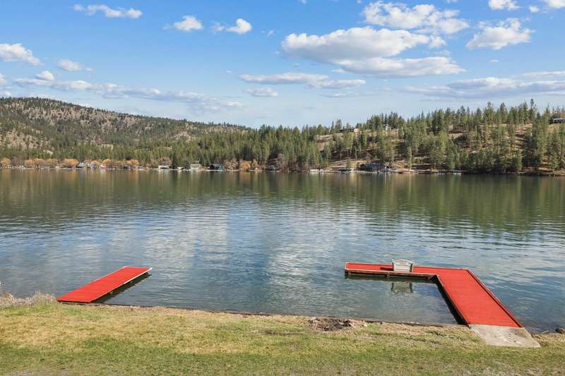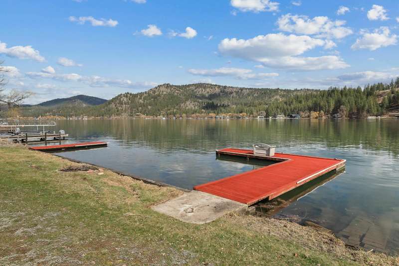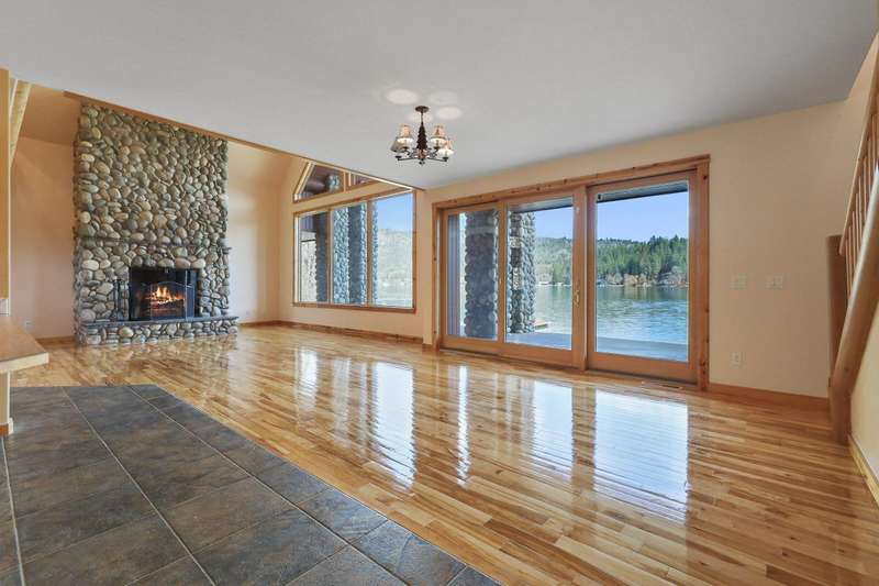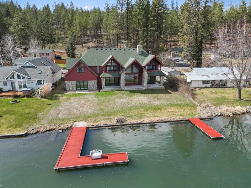 Welcome to “The Castle” of Westlake Drive, a rare, secluded, move-in ready 4 Bed, 3 Bath, river rock styled cedar WATERFRONT lodge with a unique combination of palatial space inside and out, low bank frontage, refinished natural wood floors, oversized, drive-thru 4+ garage, and beautiful mountain views! On market for the first time in 25 years and a mere 20 minutes from Spokane, this home features 100’ of WATERFRONT on the shore of the 26-mile-long Lake Spokane (known for swimming, fishing and recreation) including two private docks, a gently sloping backyard, and access to community boat launch and helipad. Enjoy the open and spacious kitchen, dining and living areas with breathtaking picture windows framing one-of-a-kind views while drinking in morning sunlight and vaulted ceilings. Rest and recharge in one, or both, of the upstairs primary suites, complete with en-suite bathrooms, private balconies and walk-in closets and connected by an elevated, open, natural wood hallway and recreation room. Tour today!