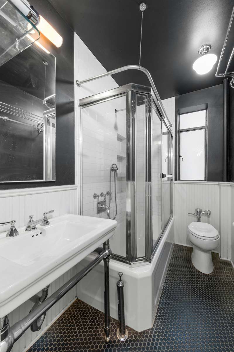 The windowed bathroom exudes classic pre-war glamour with black hex tile, gleaming chrome fixtures, and a sleek glass tub enclosure.