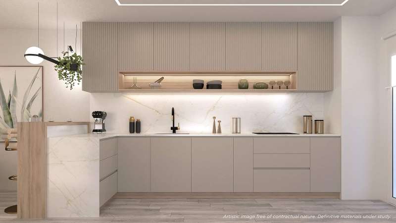 Inside these modern homes, three different models are available. The one-bedroom model includes a single bathroom, while the two- and three-bedroom models each feature two bathrooms, with an en-suite in the primary bedroom. All models offer an open-plan kitchen and dining area, along with a spacious living area.
