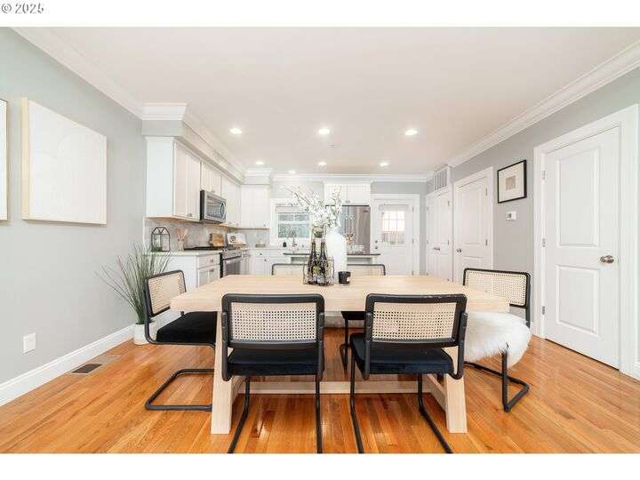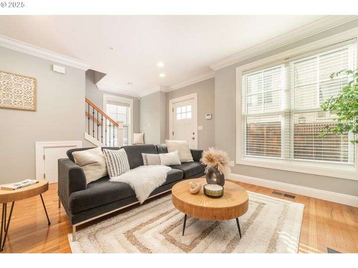 A vibrant location and superior build-quality combine to make this townhouse a great find! This end unit home has great flow while maintaining privacy between main floor living, a primary suite on the second level, plus a second bedroom suite on its own level. A versatile loft could be your work, hobby, or reading space. High-end finishes elevate this home with gleaming hardwood floors, wood windows, crown molding, walk-in closets and high-line Jenn Air appliances. When you're not enjoying your gourmet kitchen, take a short stroll to The Zipper Food Court or to NE 28th's spectacular restaurant row. Designed for effortless urban living with bike parking, a rear patio, lots of storage and stylish touches throughout. This well maintained “newer” home is better than new as it comes with window coverings, top-notch kitchen appliances, and even a washer/dryer. Walk Score 98, Bike Score 100! 2 units available, see also listing for 623 NE Randall Ave [Home Energy Score = 9. HES Report at https://rpt.greenbuildingregistry.com/hes/OR10181621]