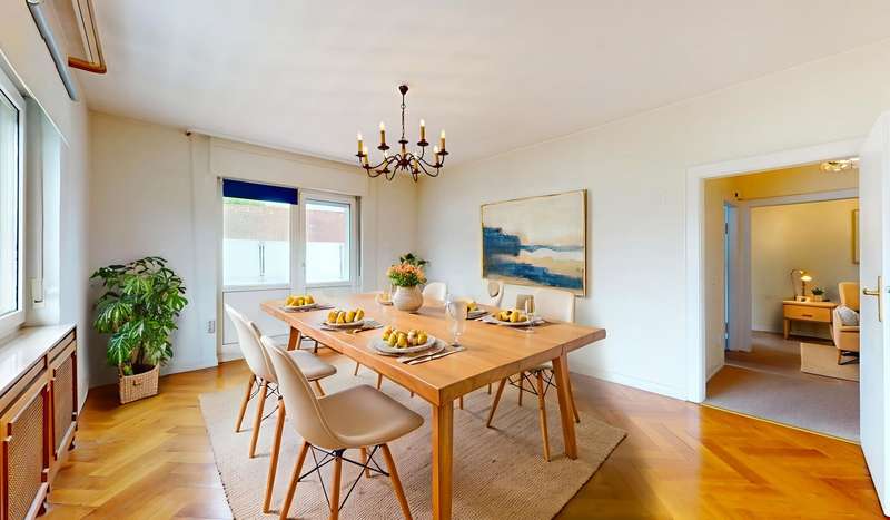 This well-designed four-room apartment impresses with its old building charm and attractive location. It is located in a well-kept apartment building with just three residential units - an ideal home for anyone who appreciates a quiet living environment in an urban setting. Situated on the edge of the sought-after Dornbusch district, the location combines urban living with quiet living comfort and excellent public transport connections. Shopping facilities, green spaces and other everyday amenities are within easy walking distance. As soon as you enter the apartment, you are greeted by a spacious entrance area with space for a checkroom. The bright living and dining area with herringbone parquet flooring offers a view of the Ginnheimer "Spargel" and access to the large north-west facing balcony - perfect for relaxing afternoons and balmy summer evenings. A beautifully designed cassette sliding door allows flexible use of the living and dining area - open plan or separately partitioned. Two well-designed bedrooms offer versatile usage options. One of them has access to a further, south-east facing balcony. The daylight bathroom is equipped with a shower, the separate kitchen is spacious and functional - ideal for individual design ideas. Having been lovingly modernized and individually furnished, this apartment will become an oasis of well-being for its new residents. A modern single garage with electricity is located directly next to the house and offers additional convenience in everyday life. The offer is complemented by a separate cellar compartment, a drying room for communal use and a storage room for bicycles accessible from the outside. This apartment is ideal for couples or families who want to combine urban living with quiet living comfort. A home with character - in an impressive location.