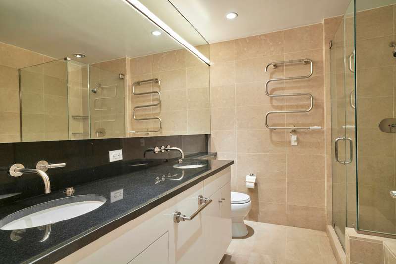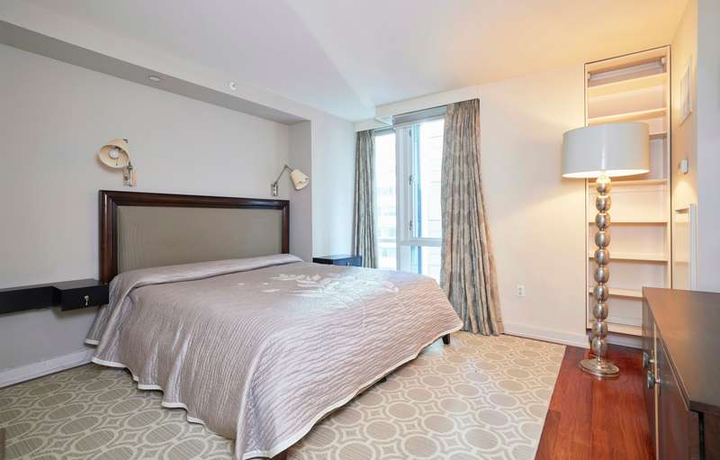 The spacious bedroom accommodates a king size bed. Two double wide enormous closets . A well appointed luxurious 5 fixture marble bathroom includes a soaking tub, separate glass enclosed stall shower, heated towel bar, and double sink and vanity.