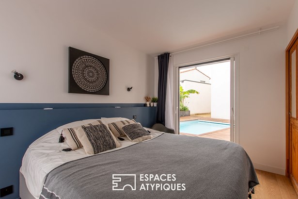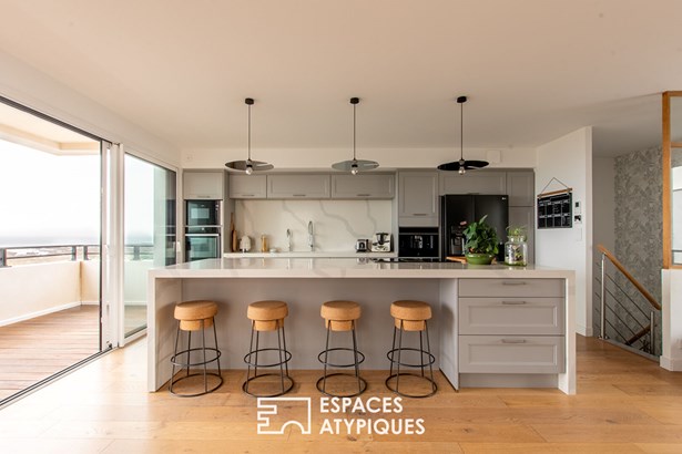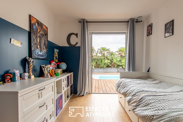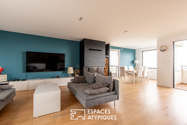 Each outdoor space has been designed to take advantage of the light and the Vendee climate, between a sunny terrace, a welcoming pergola, and a recreation area. The interior layout has been designed to combine comfort and functionality. The entrance is located on the ground floor, leading to the sleeping area composed of four bedrooms, including a master suite. Each opens onto the terrace overlooking the swimming pool. The upper floor houses the light-filled living room, extended by a balcony overlooking the ocean. The fireplace creates a warm atmosphere and the open kitchen offers a welcoming space for entertaining family and friends.