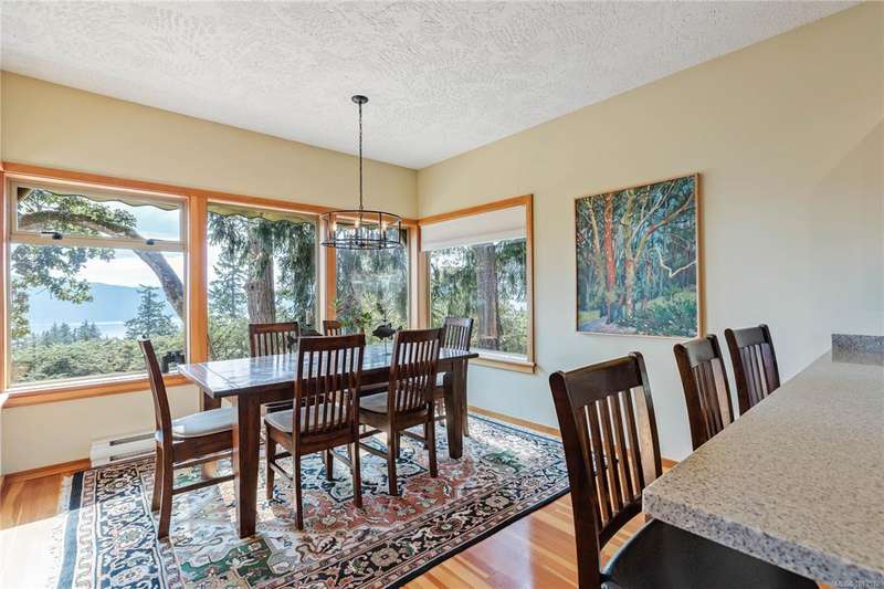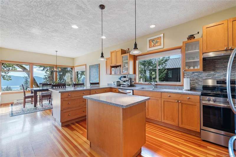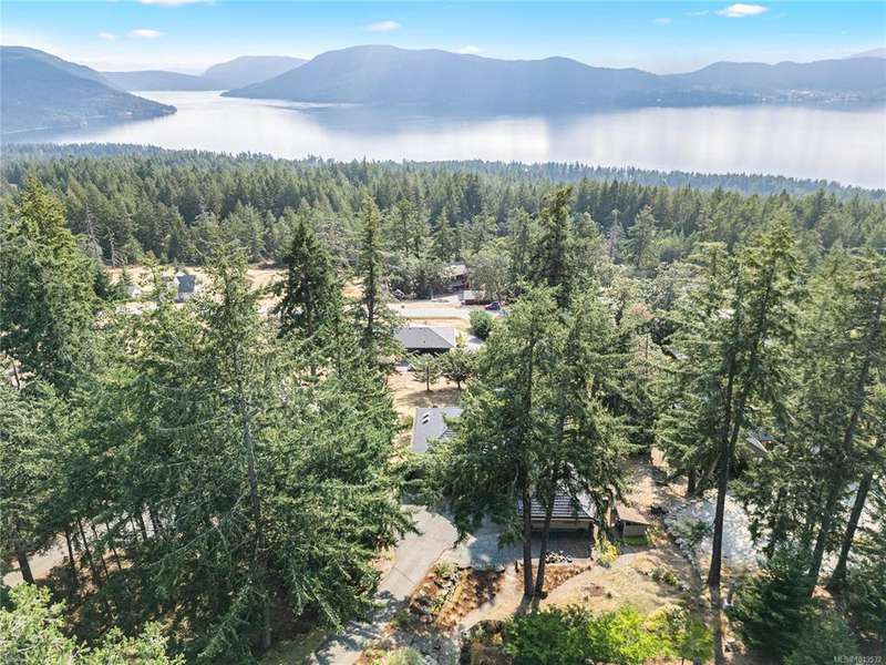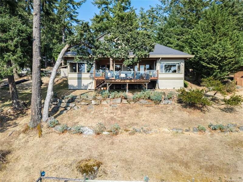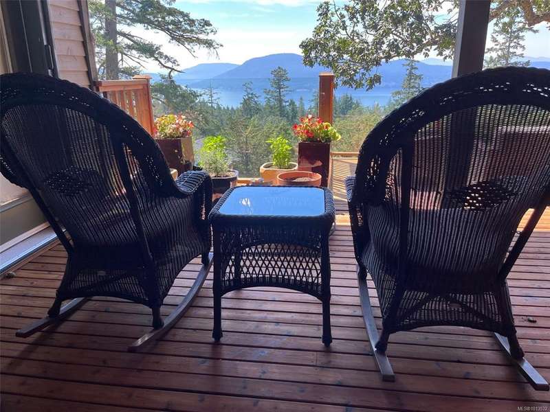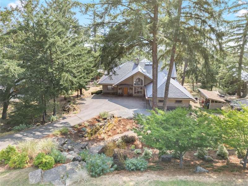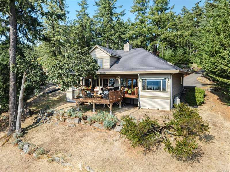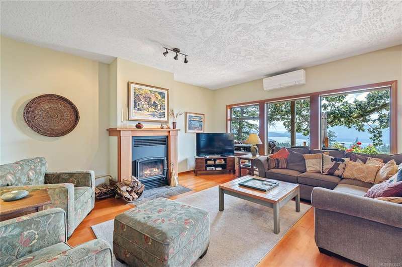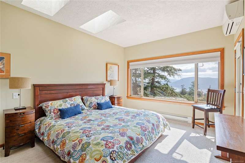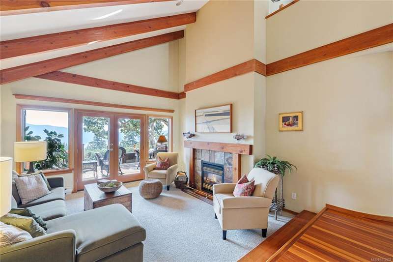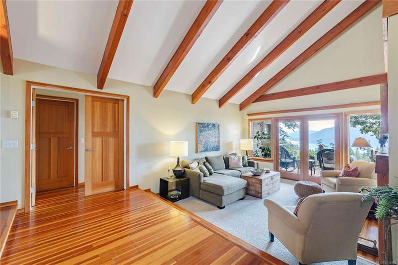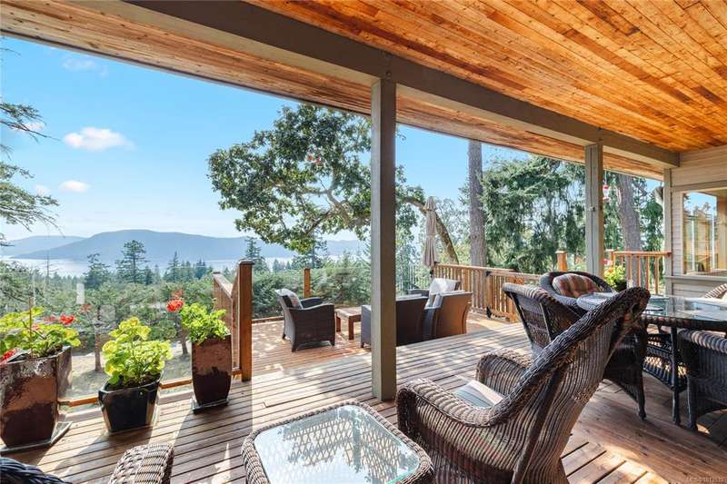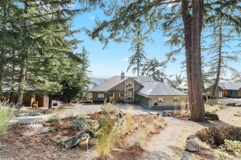 This immaculate West Coast residence offers tranquility and sweeping ocean views over Sansum Narrows to Vancouver Island, in the sought-after Channel Ridge neighbourhood. Bathed in warm western light, the quality-built home showcases contemporary main-floor living and a dramatic entry with soaring timber-beamed ceilings and gleaming fir floors, leading into the view-filled living room, including a cozy focal fireplace. Dreamy view primary suite on the main level featuring a spa-style ensuite, walk-in closet, and access to the deck and additional bedrooms/den on upper level. Chef’s dream kitchen with custom wood cabinetry, granite countertops, and a pantry area. An efficient heat pump for both warmth and cooling. Flexible garage currently houses a workshop, home gym, and storage. Fancy newer metal roof. Low-maintenance half-acre blends cultivated perennial gardens with natural West Coast landscape. Enjoy access to miles of scenic hiking trails and breathtaking sunsets. Perfect!