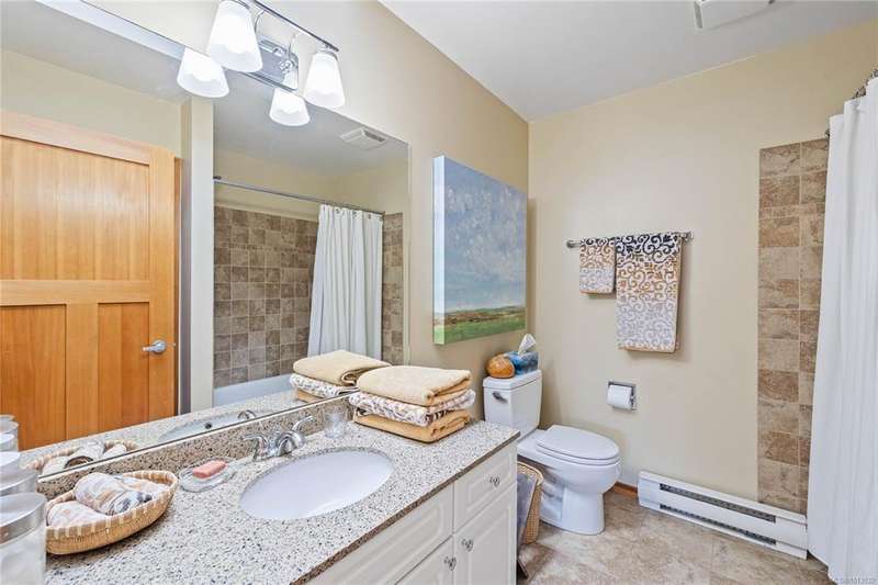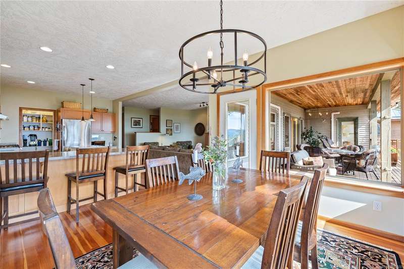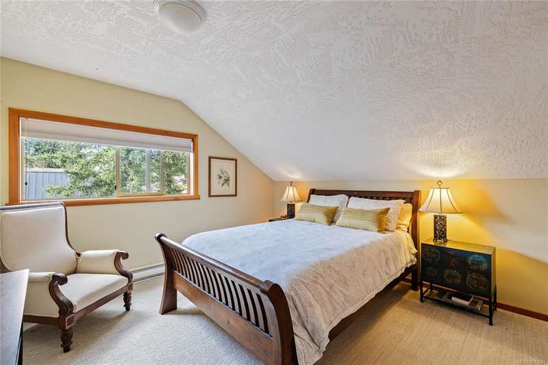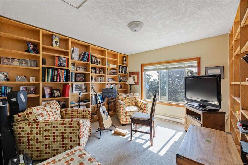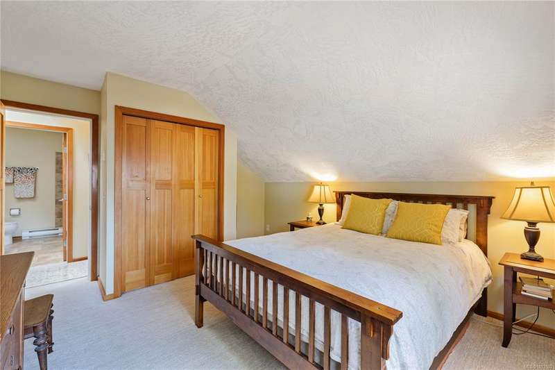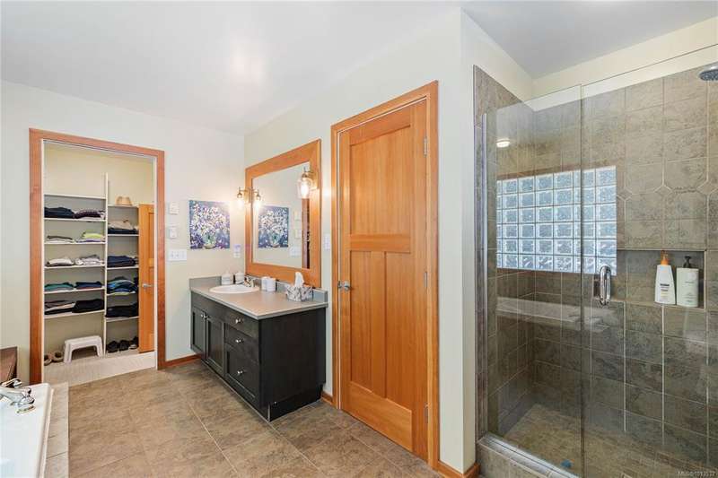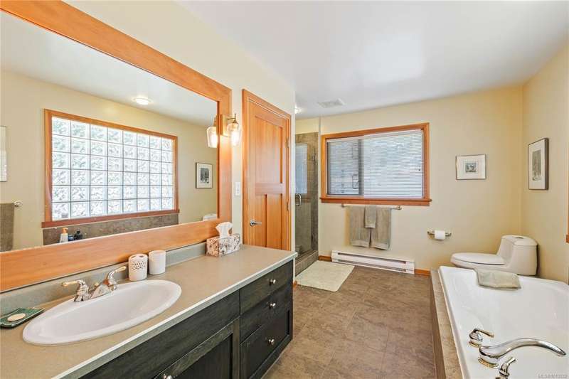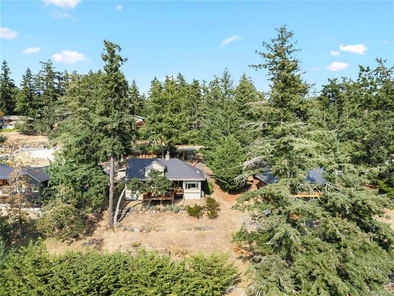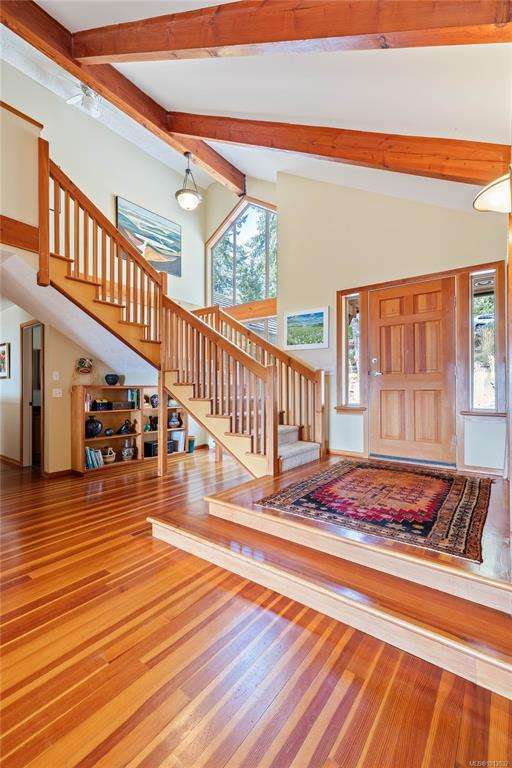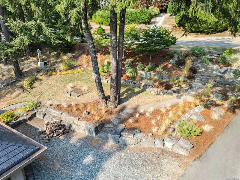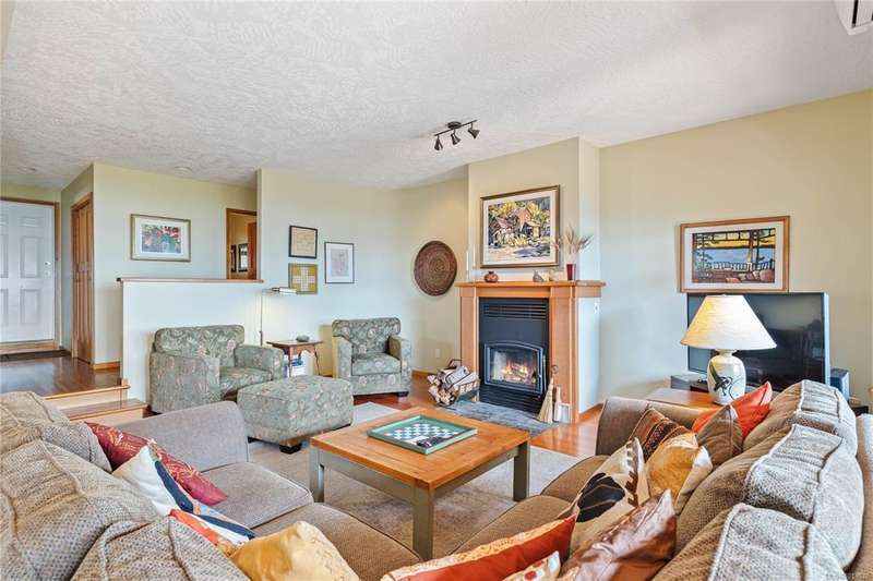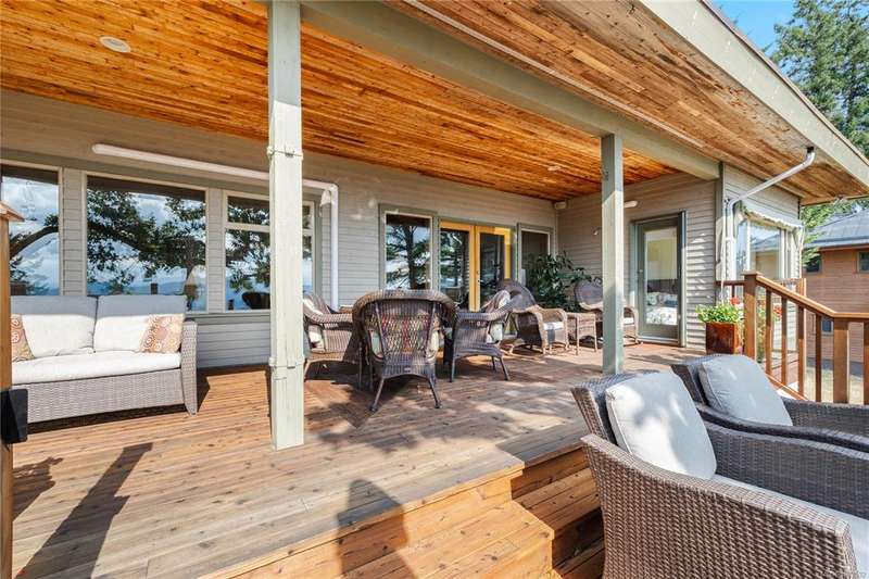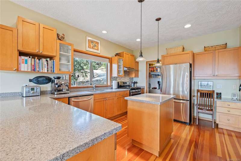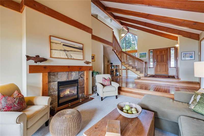 This immaculate West Coast residence offers tranquility and sweeping ocean views over Sansum Narrows to Vancouver Island, in the sought-after Channel Ridge neighbourhood. Bathed in warm western light, the quality-built home showcases contemporary main-floor living and a dramatic entry with soaring timber-beamed ceilings and gleaming fir floors, leading into the view-filled living room, including a cozy focal fireplace. Dreamy view primary suite on the main level featuring a spa-style ensuite, walk-in closet, and access to the deck and additional bedrooms/den on upper level. Chef’s dream kitchen with custom wood cabinetry, granite countertops, and a pantry area. An efficient heat pump for both warmth and cooling. Flexible garage currently houses a workshop, home gym, and storage. Fancy newer metal roof. Low-maintenance half-acre blends cultivated perennial gardens with natural West Coast landscape. Enjoy access to miles of scenic hiking trails and breathtaking sunsets. Perfect!