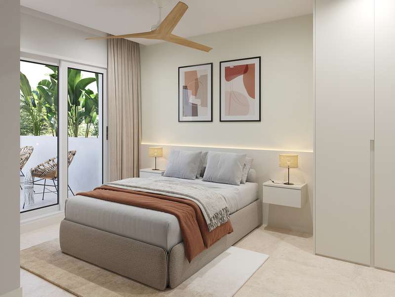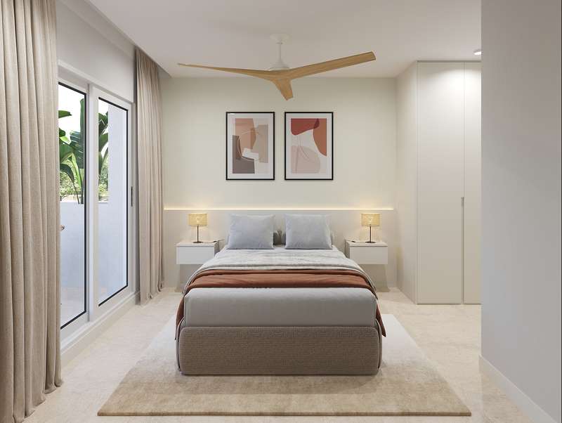 Inside these modern villas on the ground floor, you have a spacious double bedroom with a fitted wardrobe, a bathroom with a walk-in shower, an open plan kitchen and dining area, and a sizable living area. Upstairs you have two double bedrooms both with fitted wardrobes, en-suite bathrooms with walk-in showers, and private balconies.