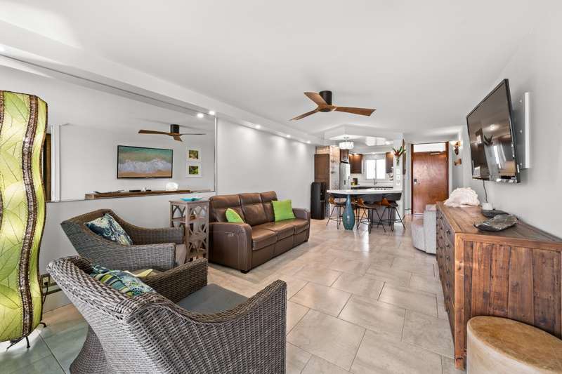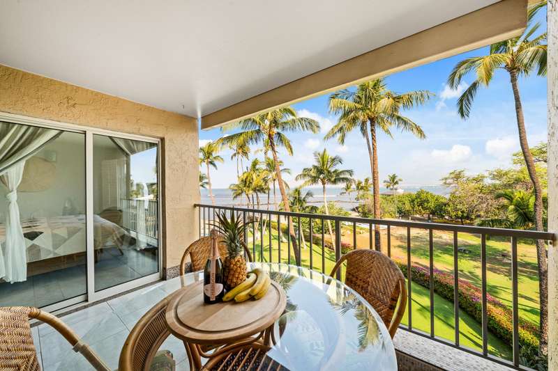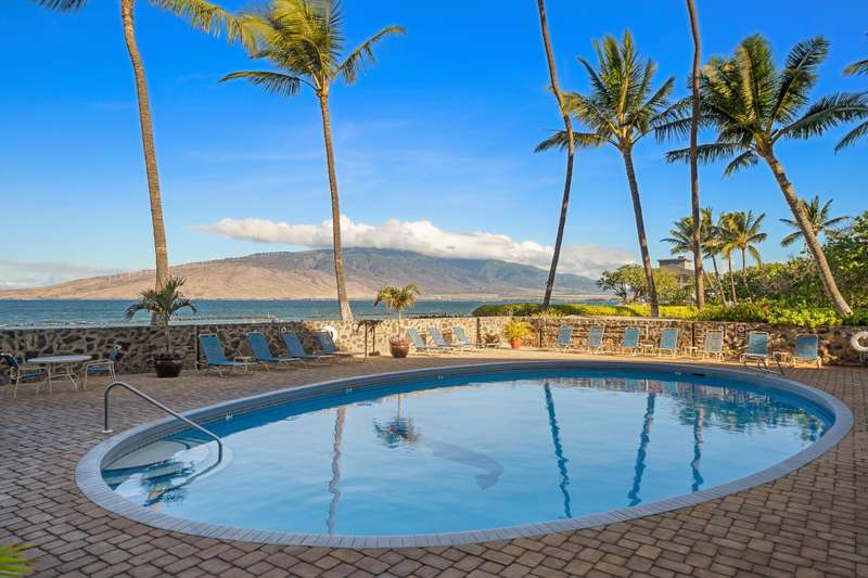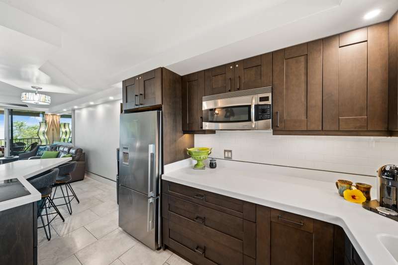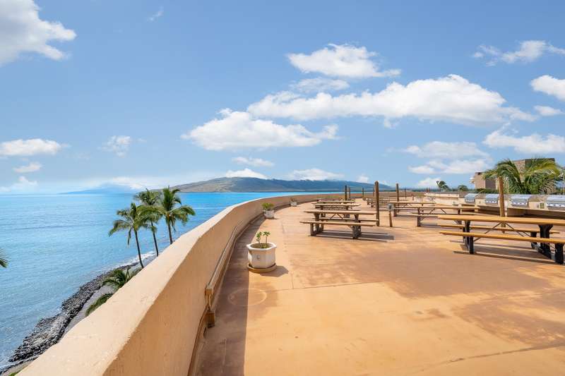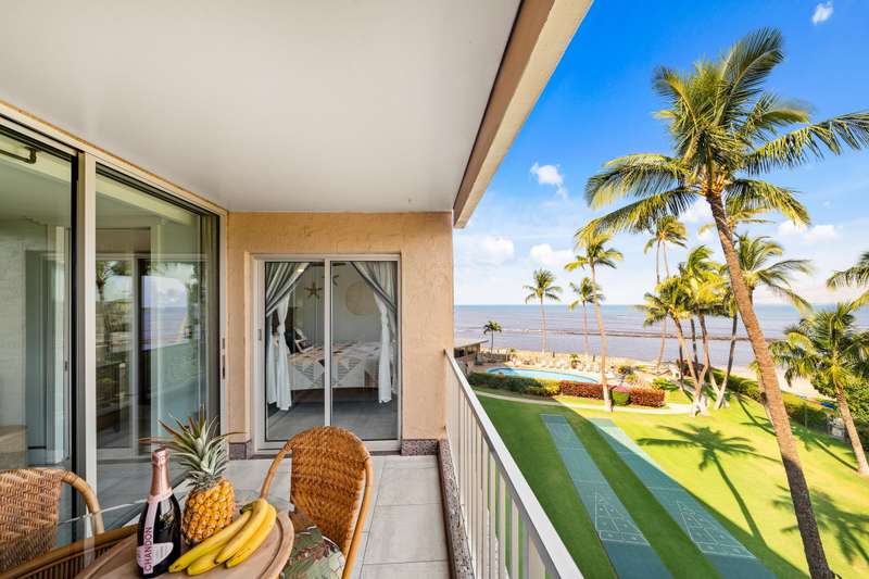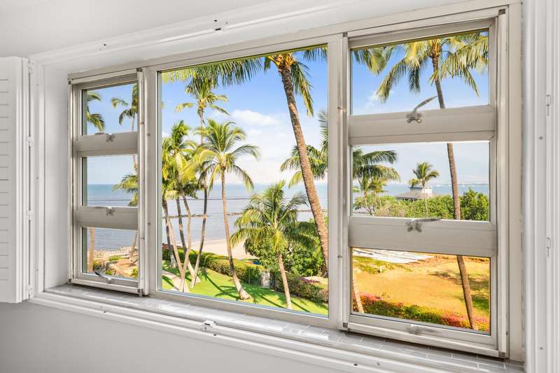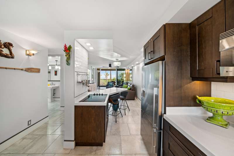 Hotel Zoned, one-of-a-kind stunning remodel at Menehune Shores. Ocean, Maalae'a and West Maui mountain views abound as you step through the front door. So many luxury touches throughout make this condo live like a home. The chef inspired kitchen has been completely reimagined. Exclusive appliances include Fisher Pakel refrigerator, KitchenAid drawer dishwasher, GE profile convection oven/microwave, and full size LG front load washer and dryer. Custom Avonite kitchen countertops feature an integral drainboard with a sink that is oriented towards the front window so you may enjoy Haleakala and Upcountry views. The cooktop flows into a unique dining island with space for four. Fleetwood windows throughout with the exception of the jalousies in the Primary Bedroom. The Primary Bedroom and its reconfiguration sets it apart from others in the complex. Restoration Hardware storage furniture is included in this "turn-Key" condo. Luxury tile in both bathrooms lends to a spa like feel. The second bedroom features a custom built "Murphy" style bed, cabinetry and plantation shutters. Menehune shores sits beachfront in front of a historical Hawaiian fish pond, with adjacent lawn area and shuffleboard. Choose between the beachfront barbecue area or rooftop deck entertainment area with barbecues and kitchen all while watching the whales play, when in season and enjoy magnificent sunsets and stargazing opportunities. Outer island views of Kaho'olawe, Molokini Crater, Lana'i and the West Maui Mountains can be enjoyed poolside. Centrally located to all island beaches, water and sport activities, boat harbors, world class dining, shopping, golf and resorts. There's even a restaurant on the ground floor! You won't want to miss this one. Easy to show with 24 hour notice.